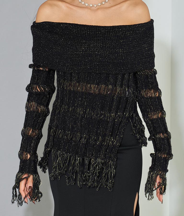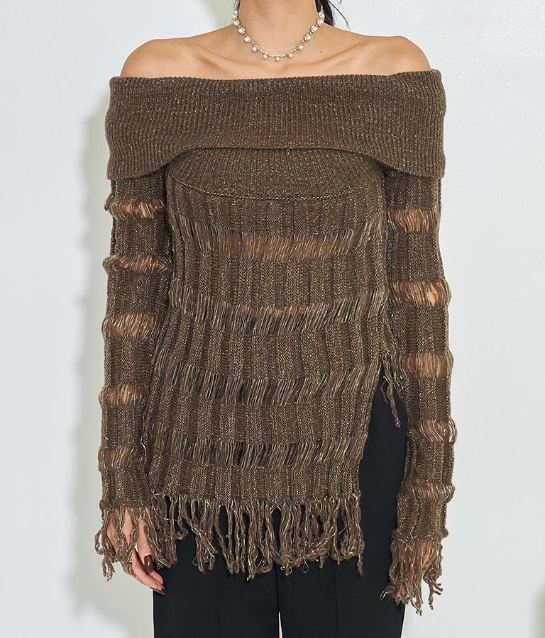 フリンジ ダメージ オフショルダー 肩開き ラメ ニット セーター 長袖 403-8524