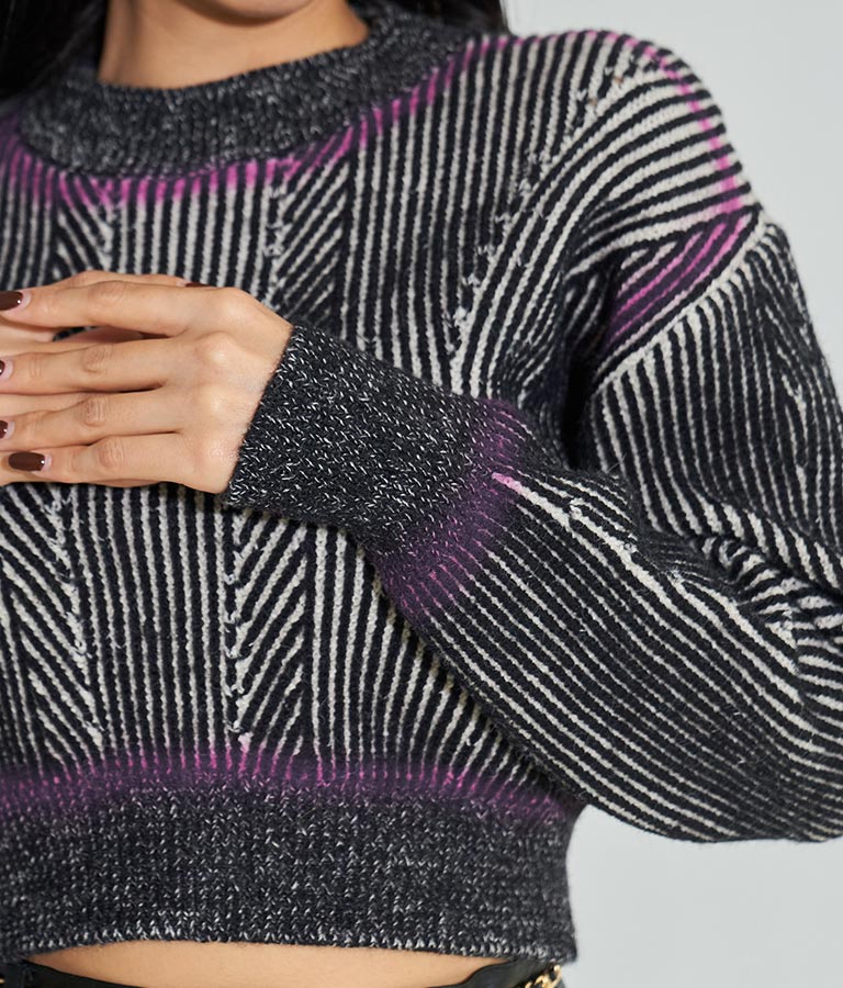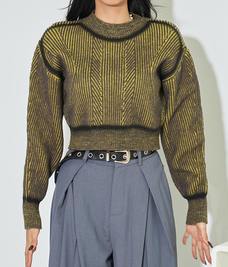 幾何学柄 スプレーライン クロップド 起毛 ニット セーターハイネック 長袖 -