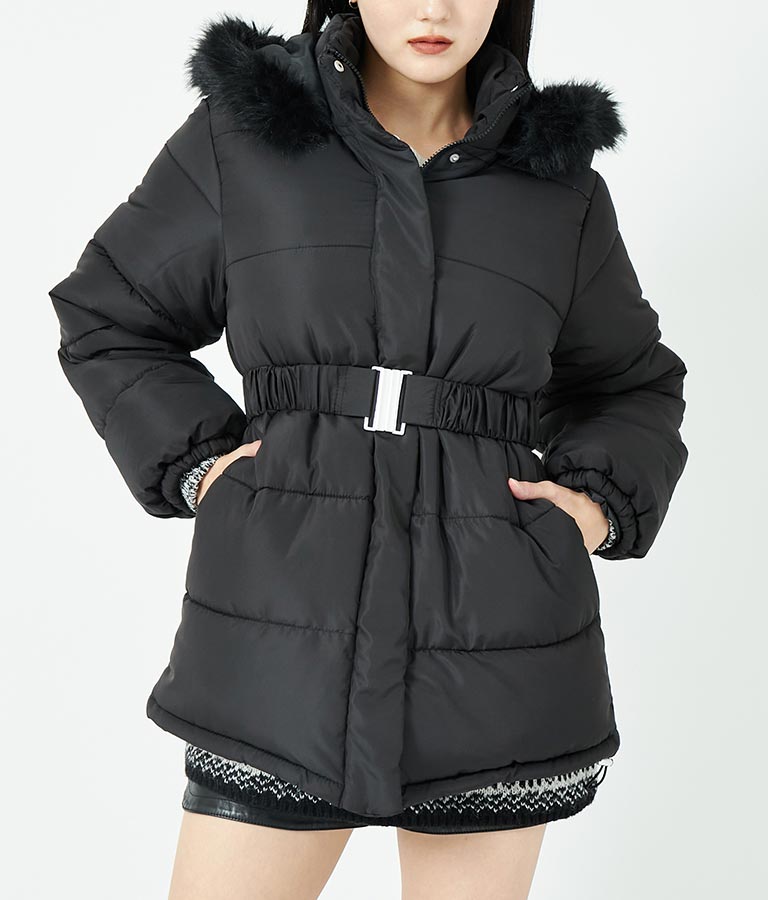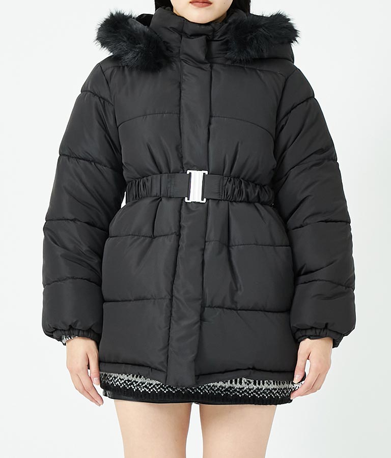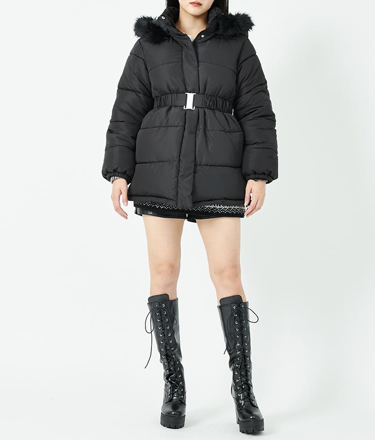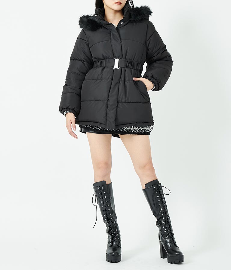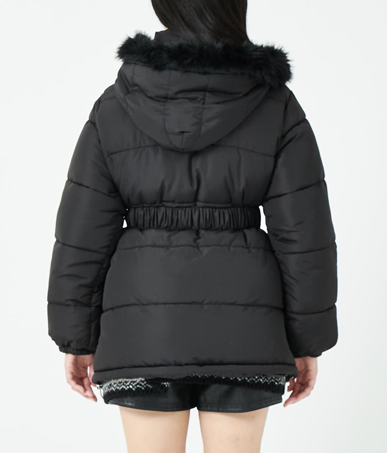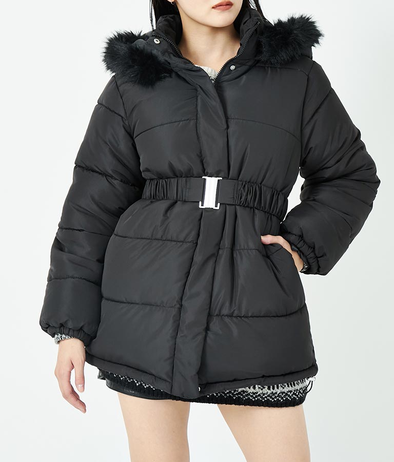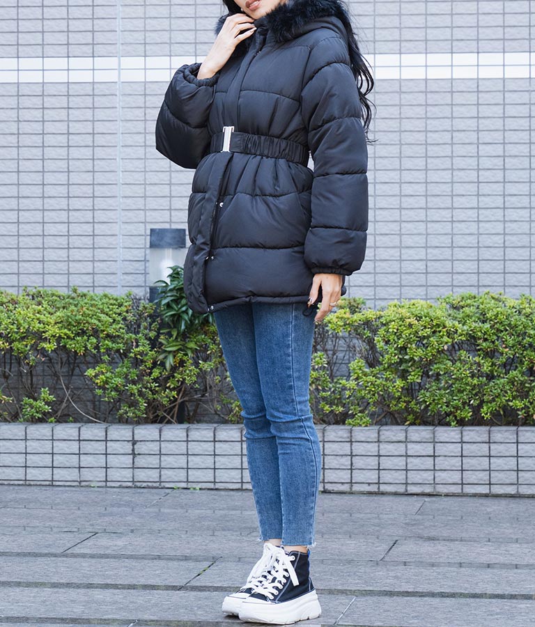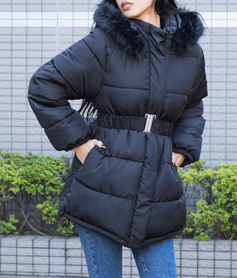 ベルト付き フェイクファーフード 中綿 コート 496-2581