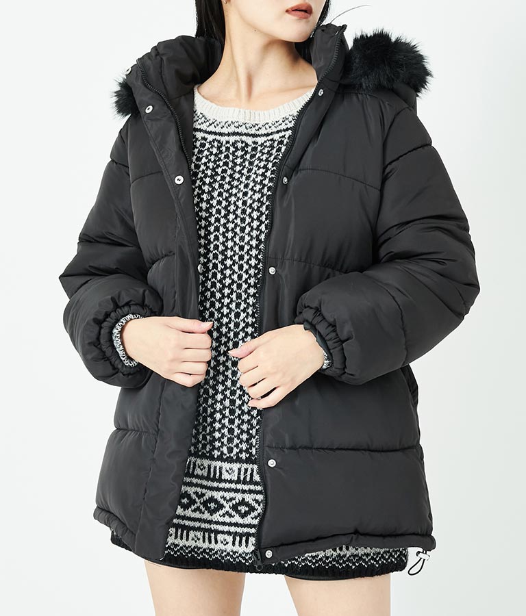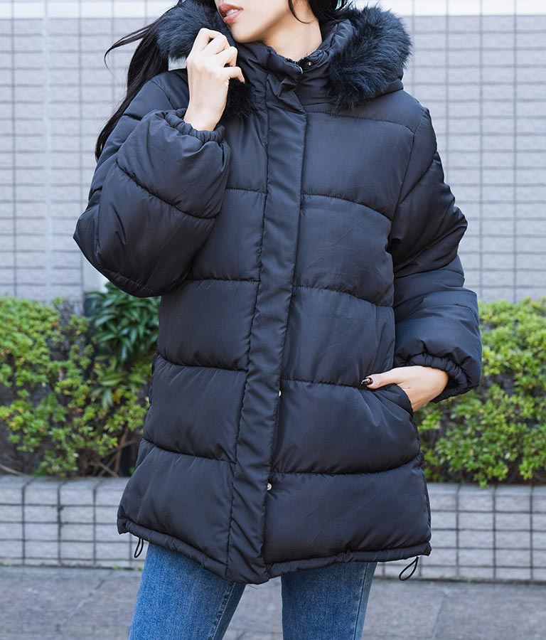 ファー付きのフードがシーズンムードを一層高め、顔周りにボリュームが出るため小顔効果も◎