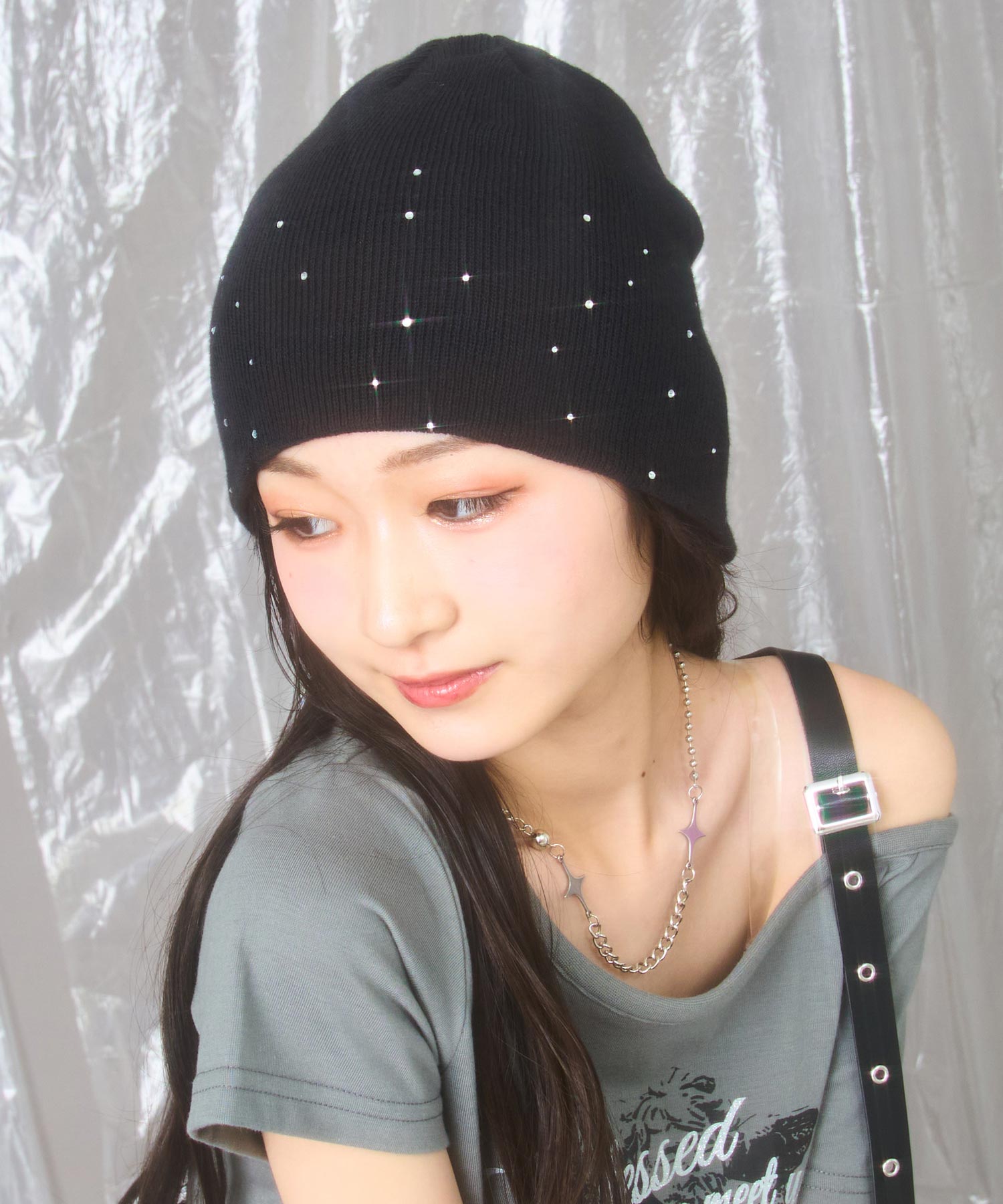きらめくラインストーンが、顔まわりを華やかに引き立てます。