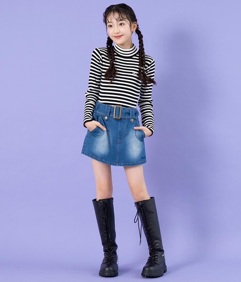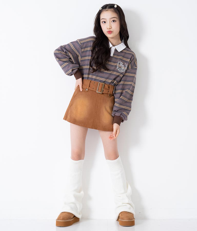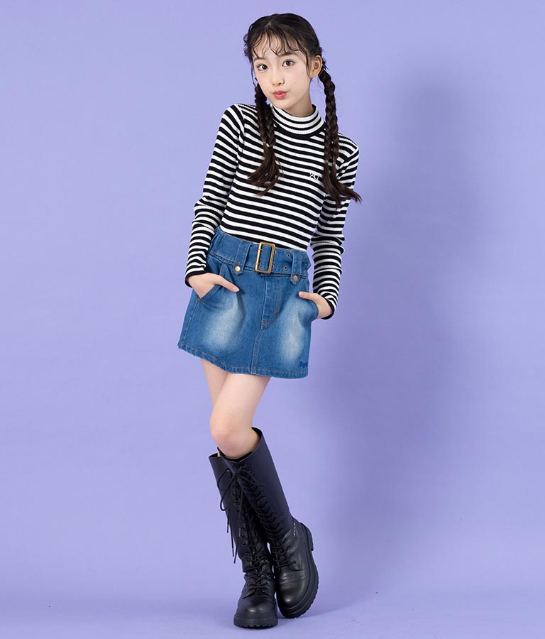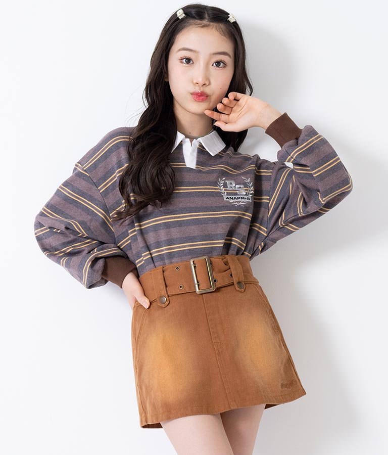 台形のシンプルなシルエットにゴツめのベルトがスタイリングのクールなアクセントになります♪