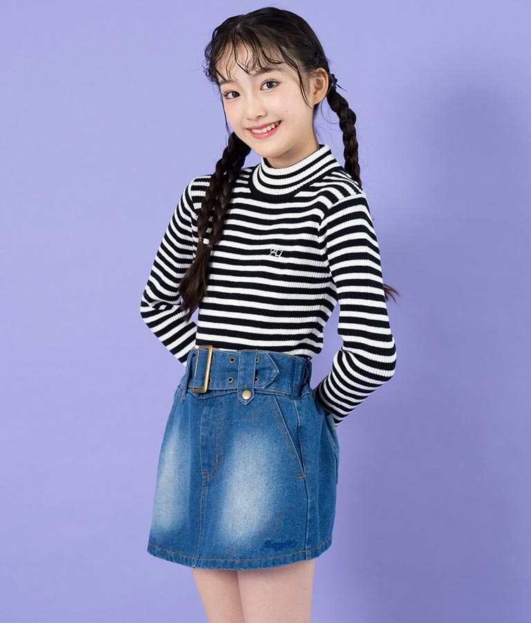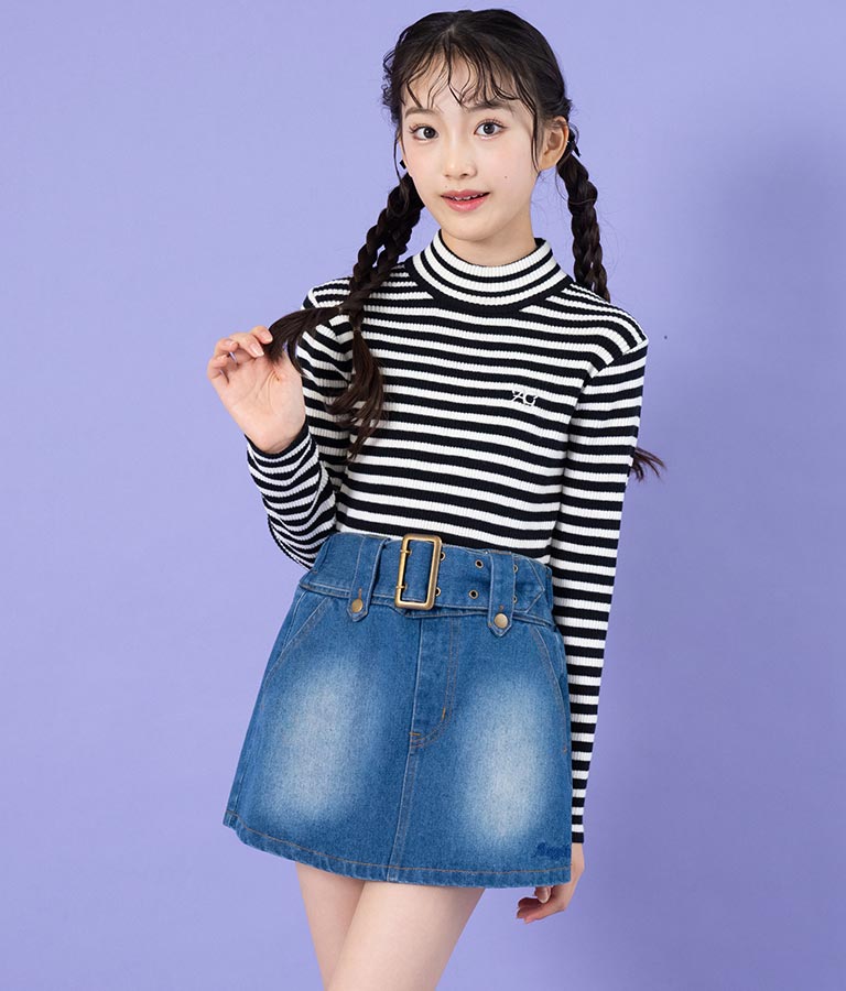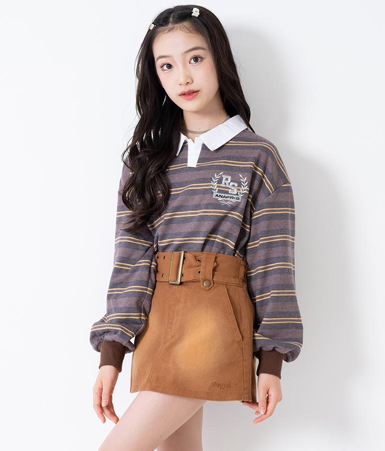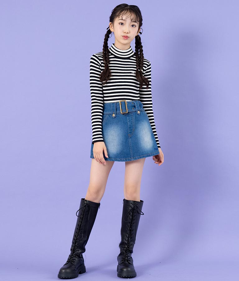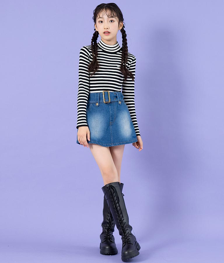 台形のシンプルなシルエットにゴツめのベルトがスタイリングのクールなアクセントになります♪