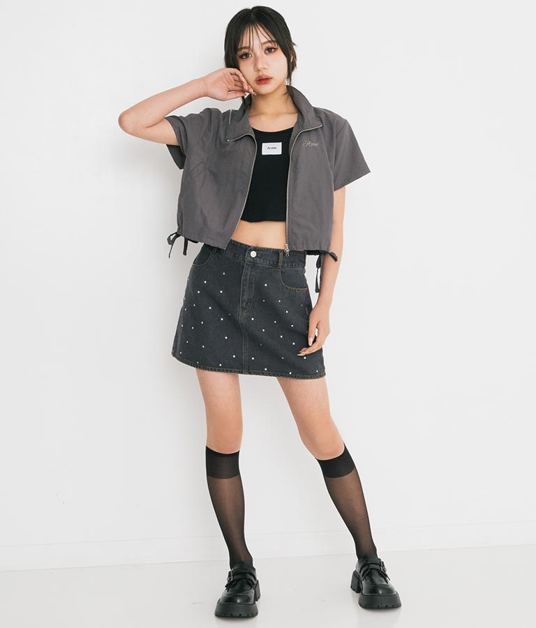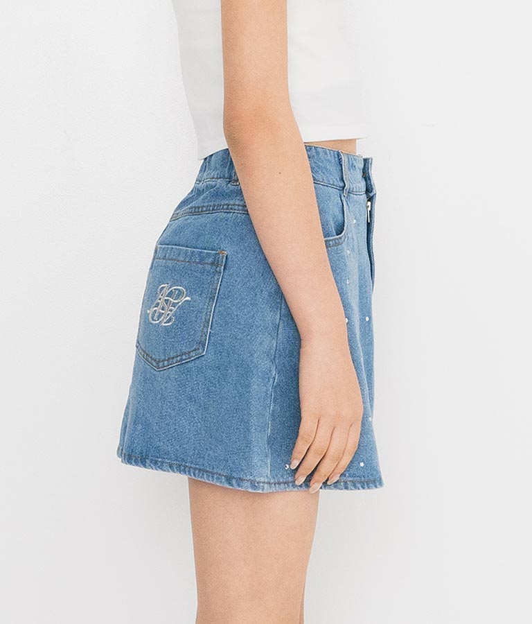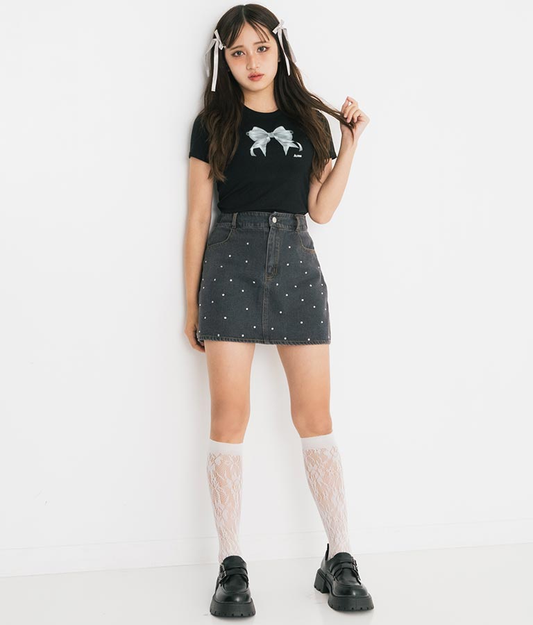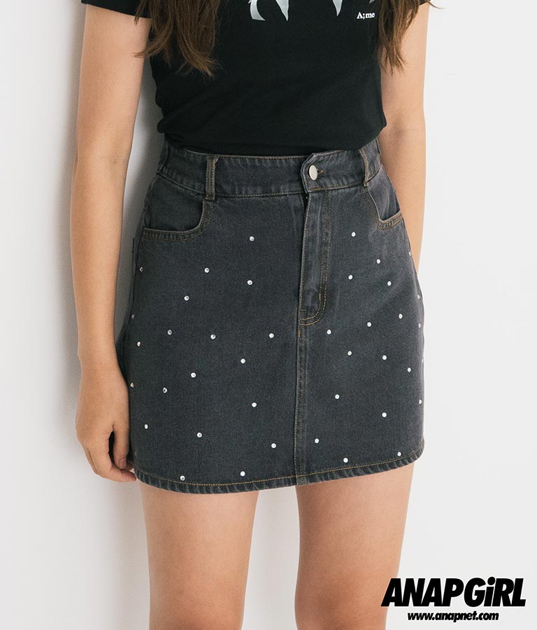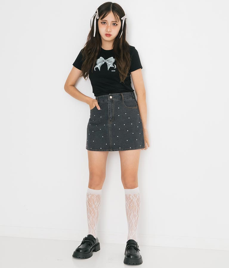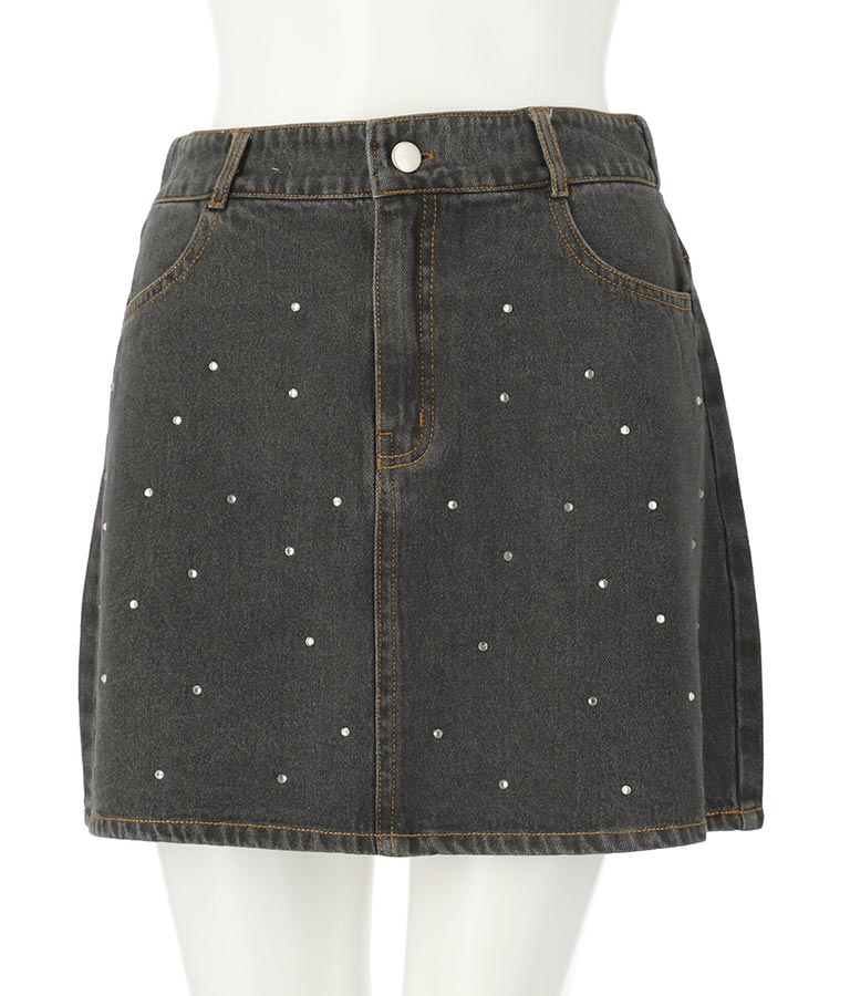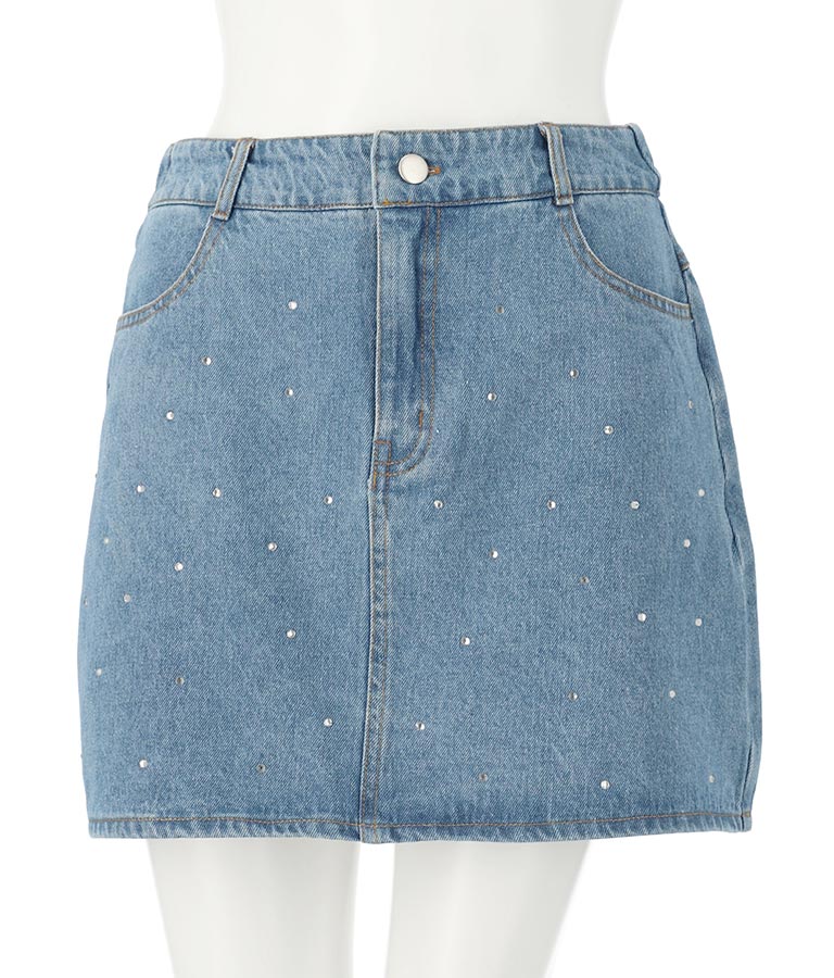 キラキラのラインストーンを散りばめたデザインがトレンド感たっぷりなデニムスカート。