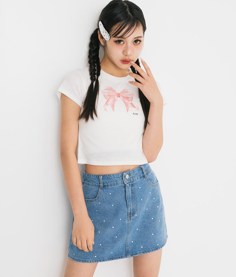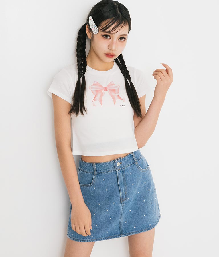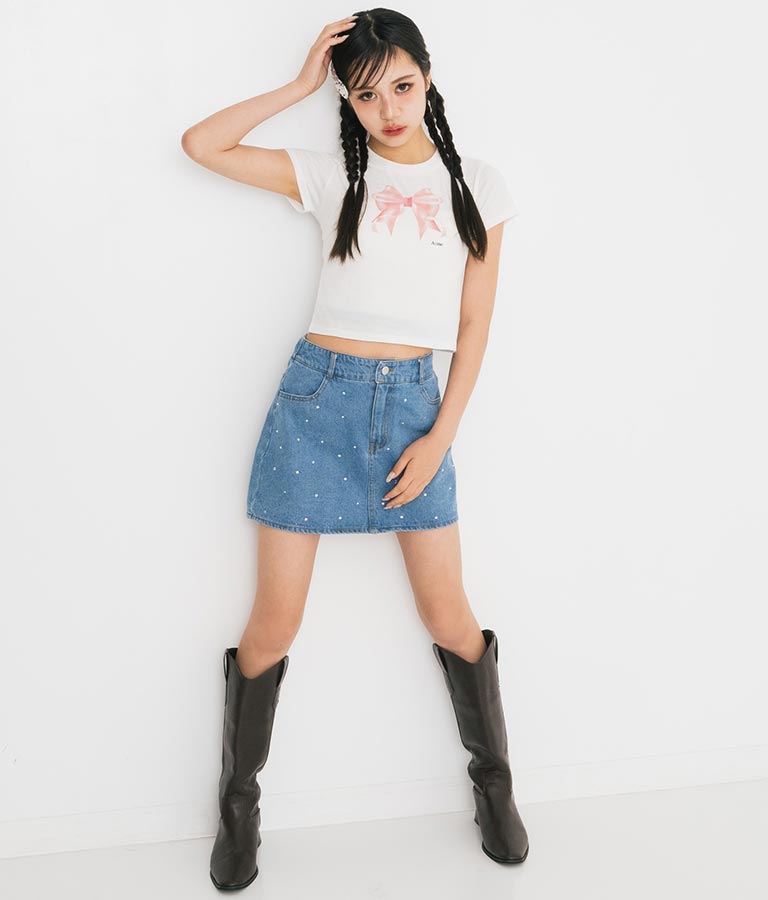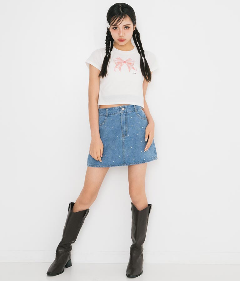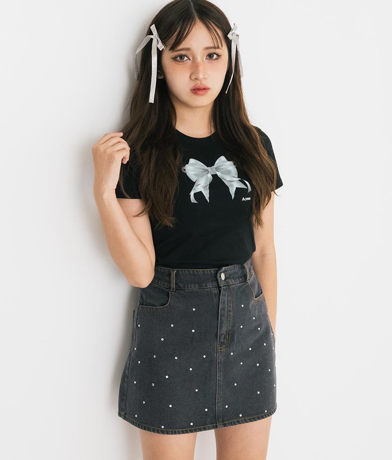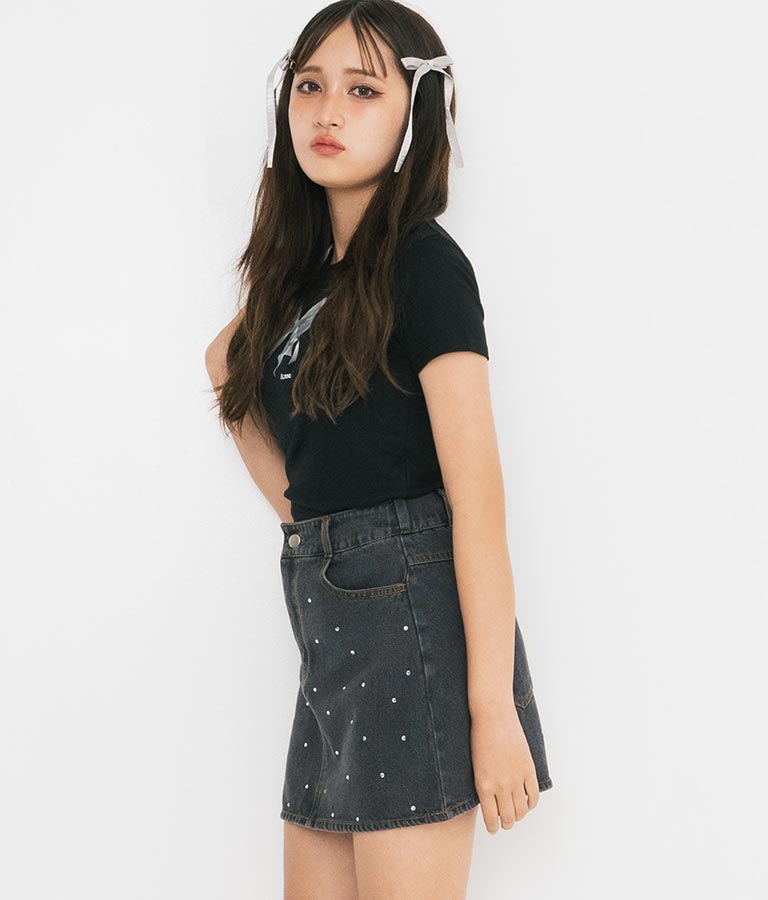 【ティーンズライン】ラインストーン デニム ミニ スカート (M、Lサイズ展開) -