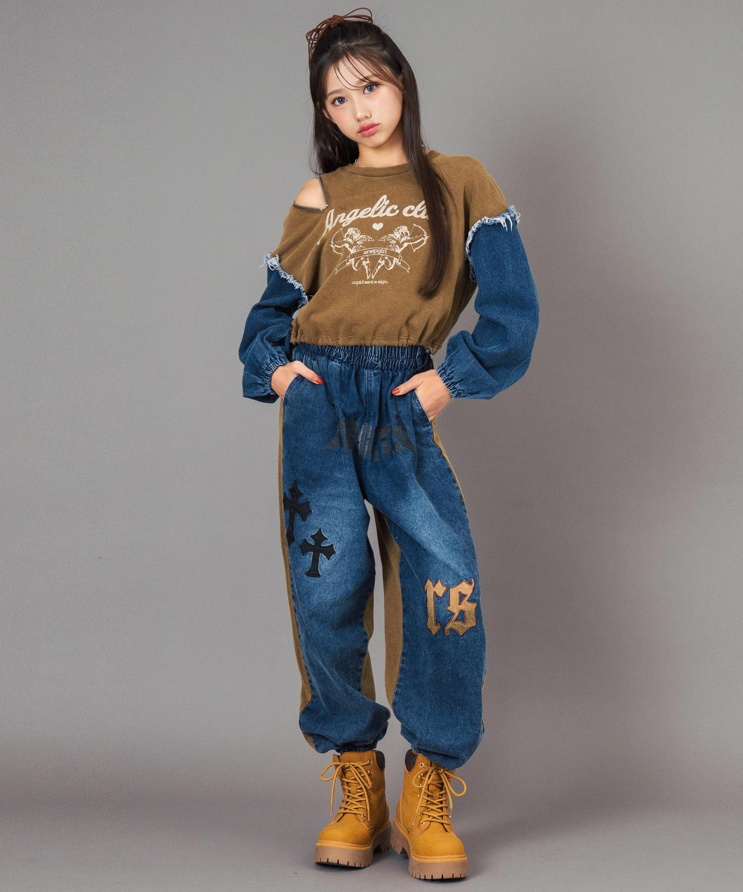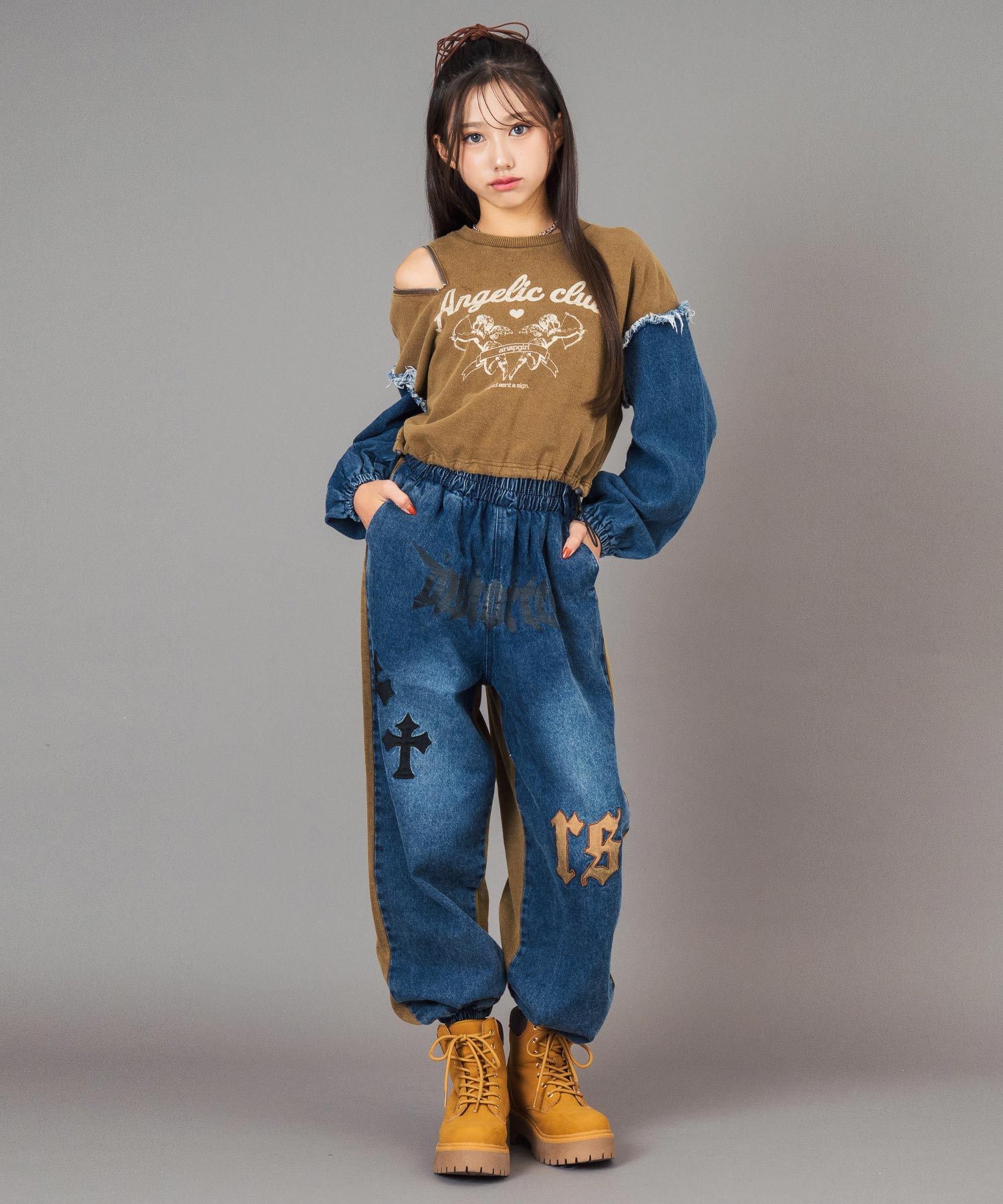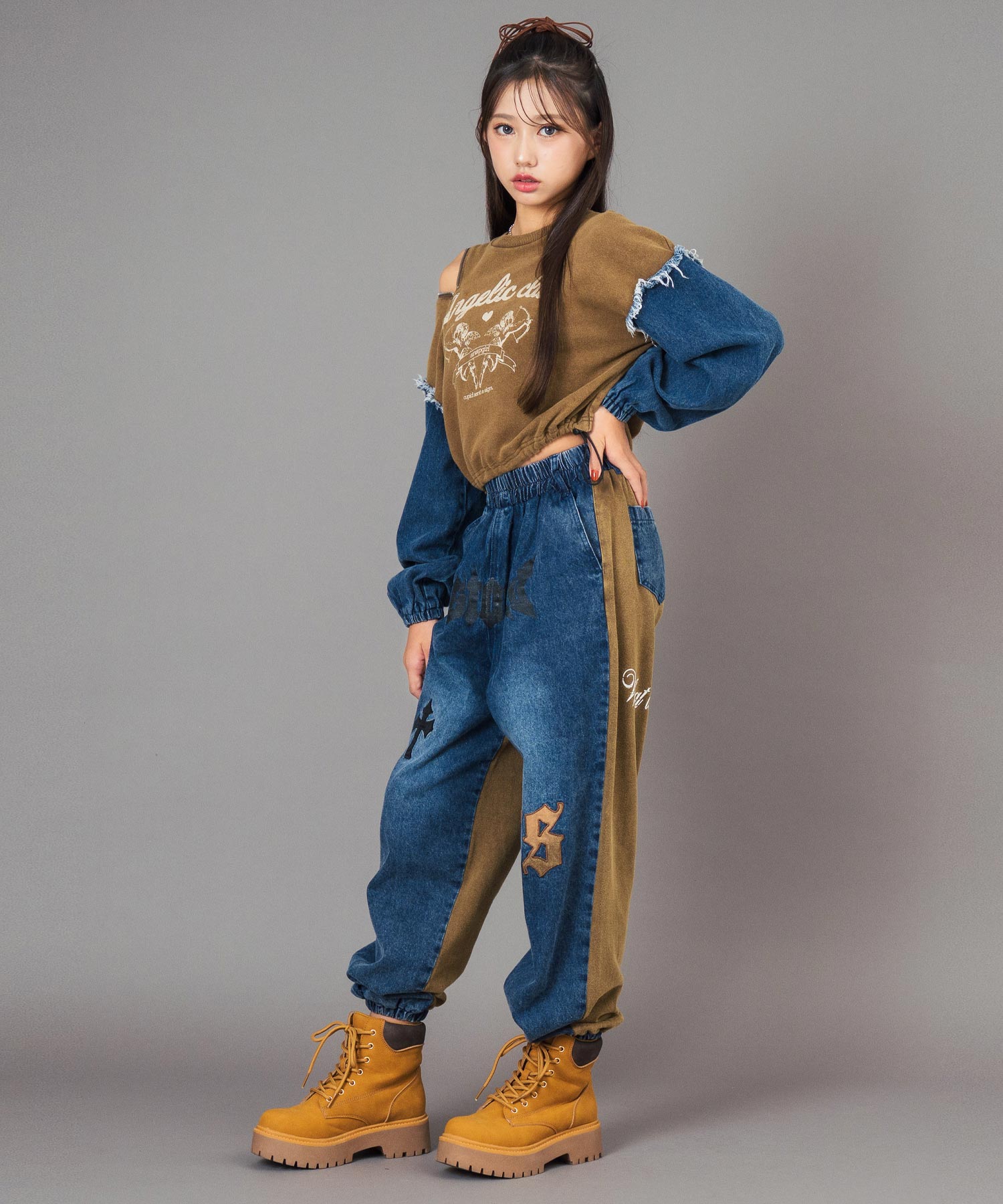 ブリーチデニム×スウェットの大胆な切り替えが視線を集める主役ボトム。