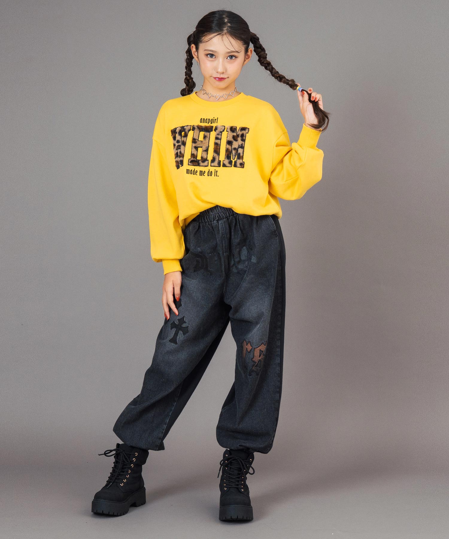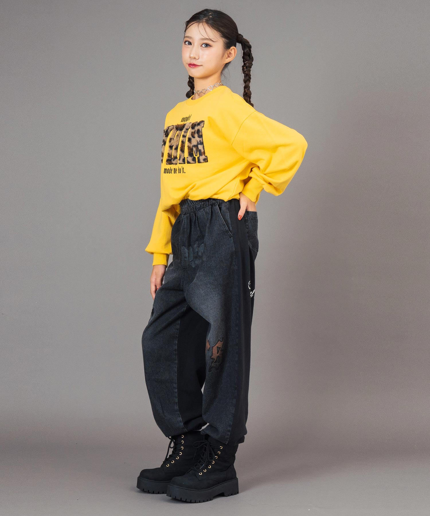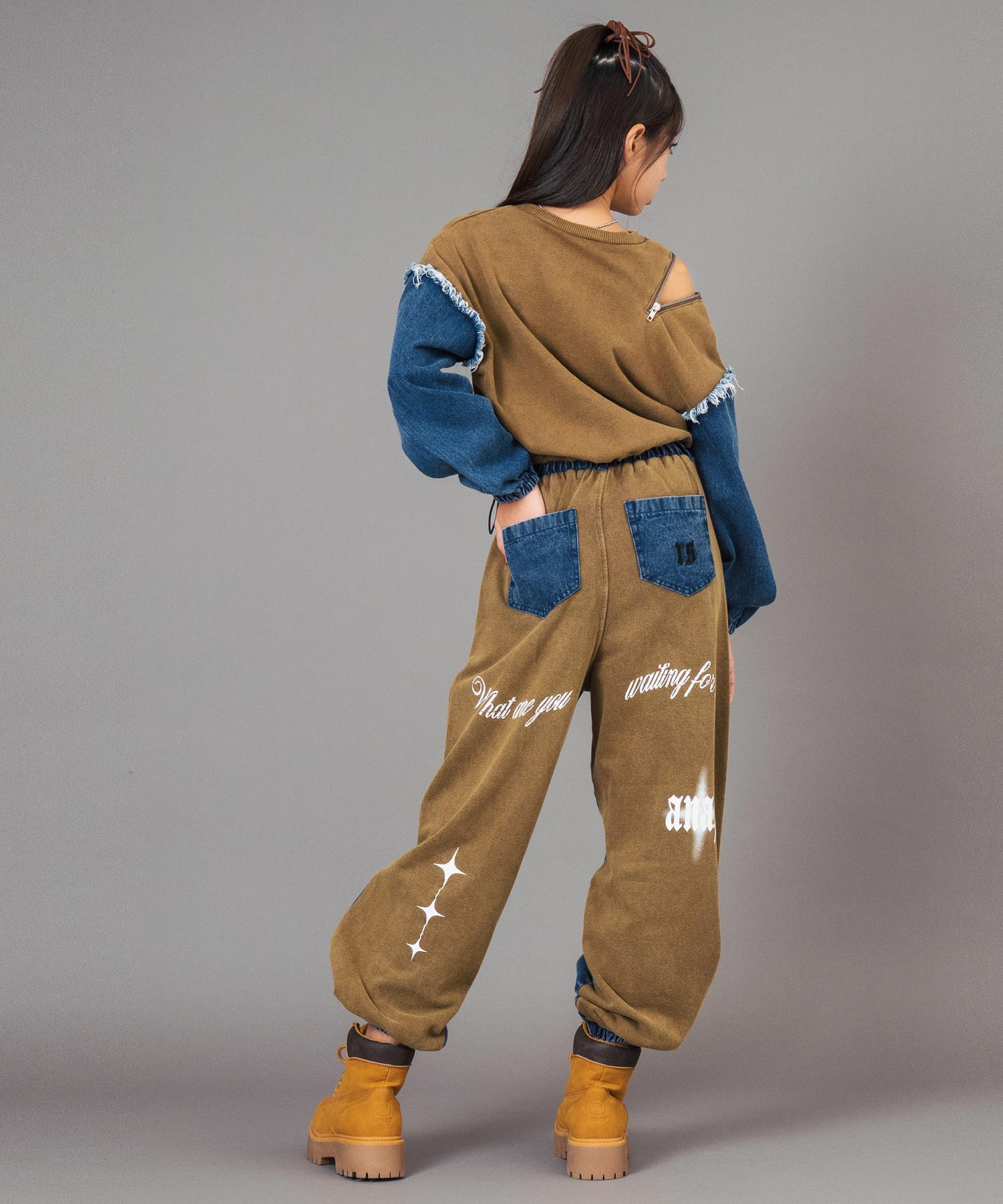 ブリーチデニム×スウェットの大胆な切り替えが視線を集める主役ボトム。