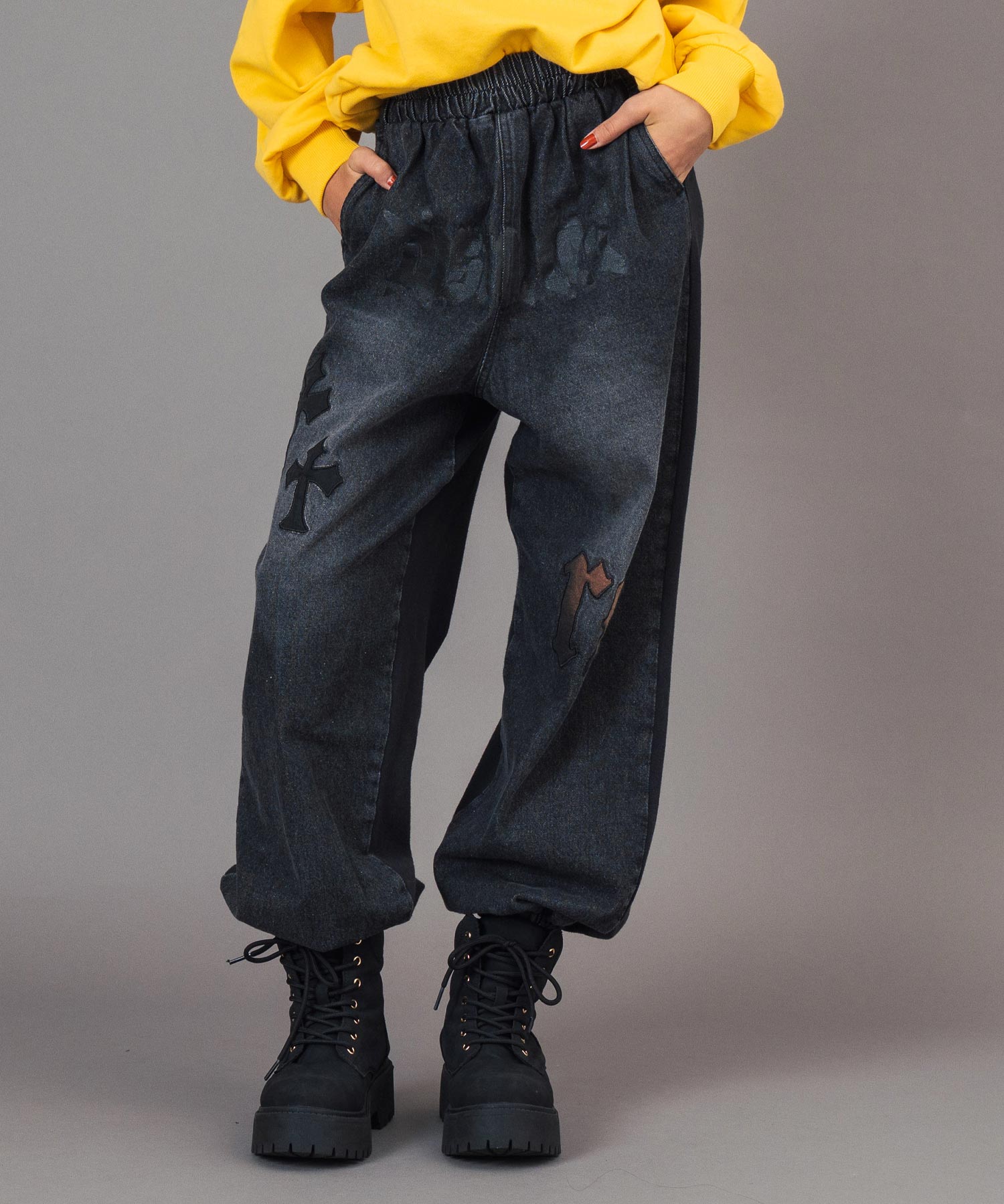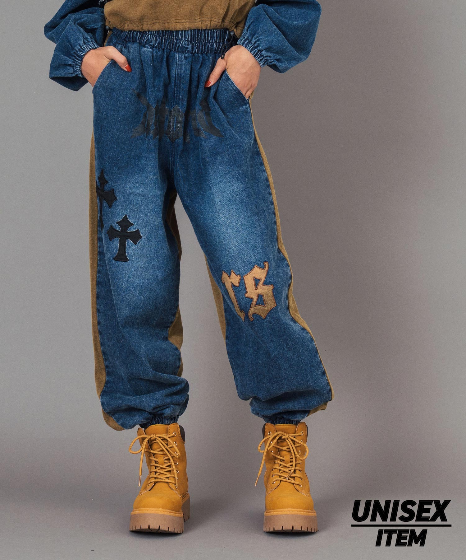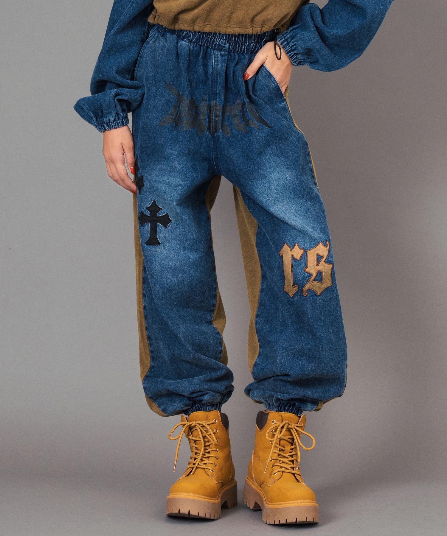 デニムとスウェットの切り替えが印象的なジョガーパンツ。