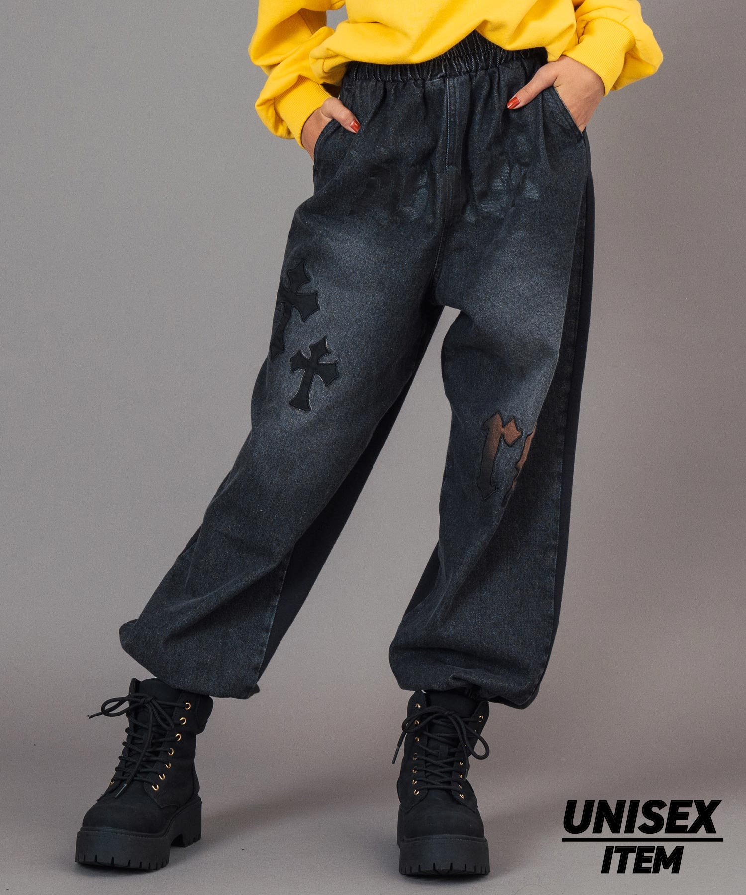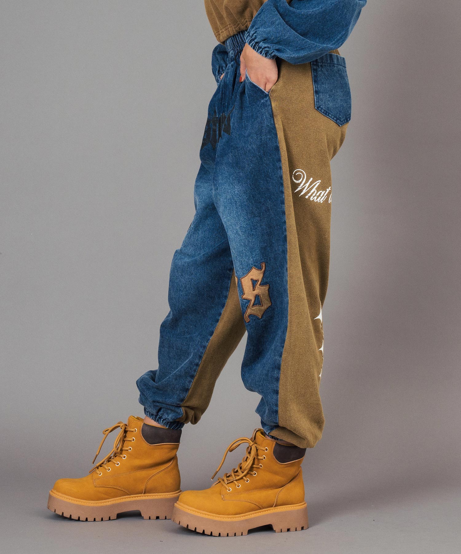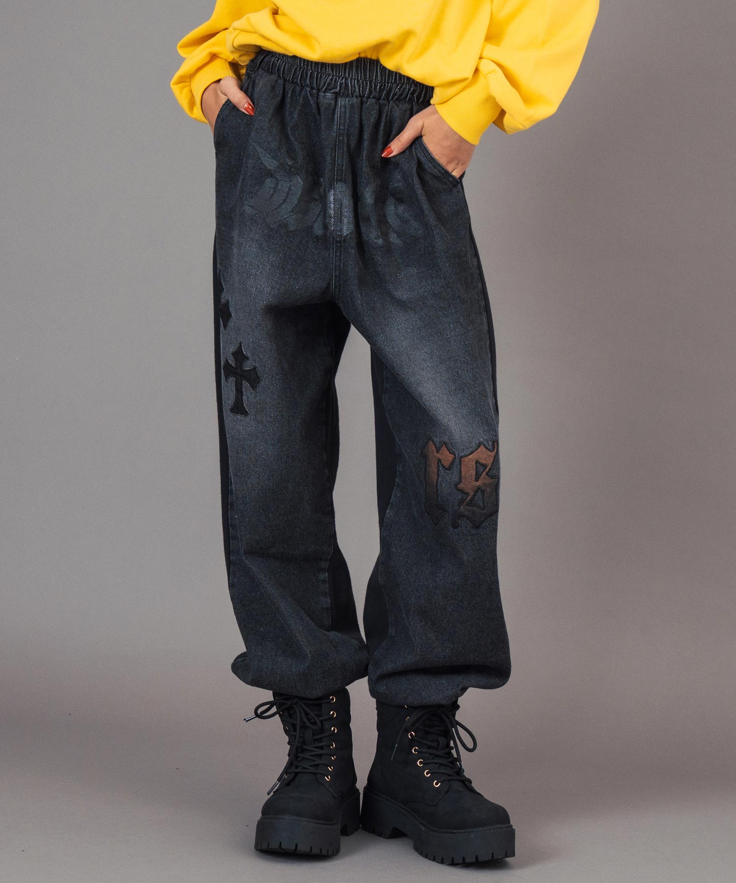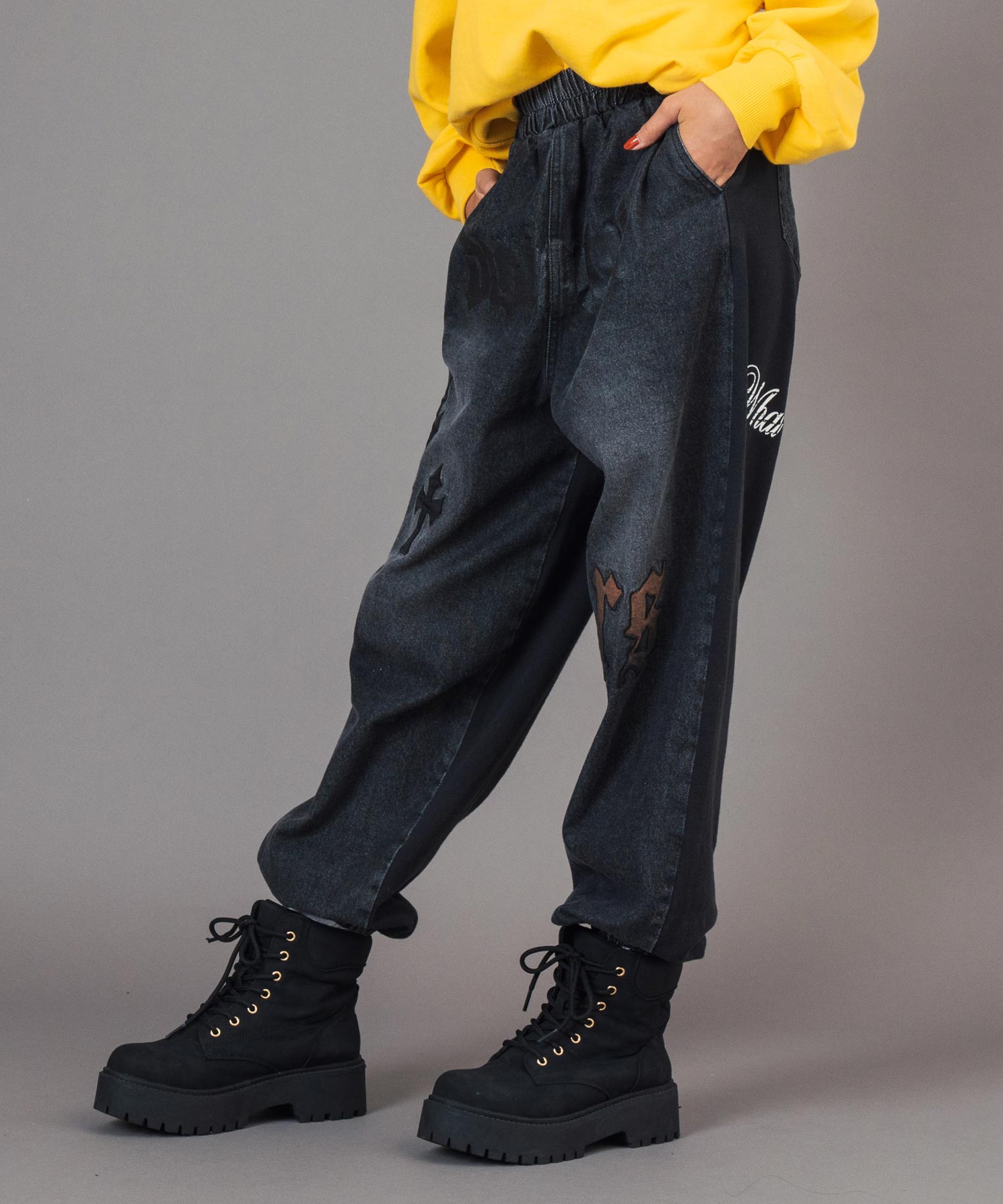 デニムとスウェットの切り替えが印象的なジョガーパンツ。