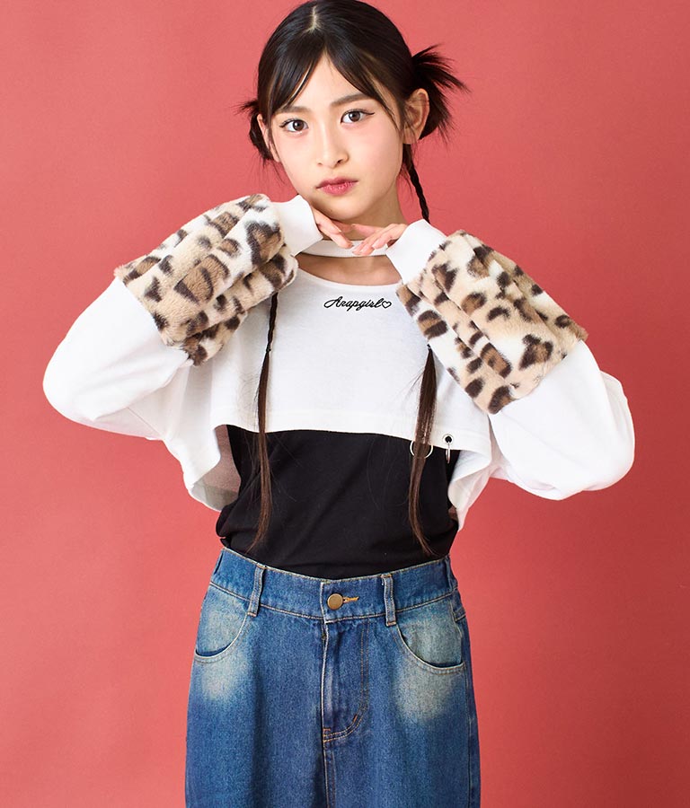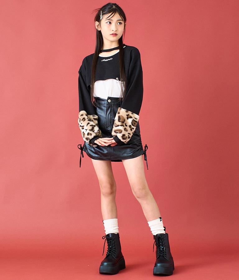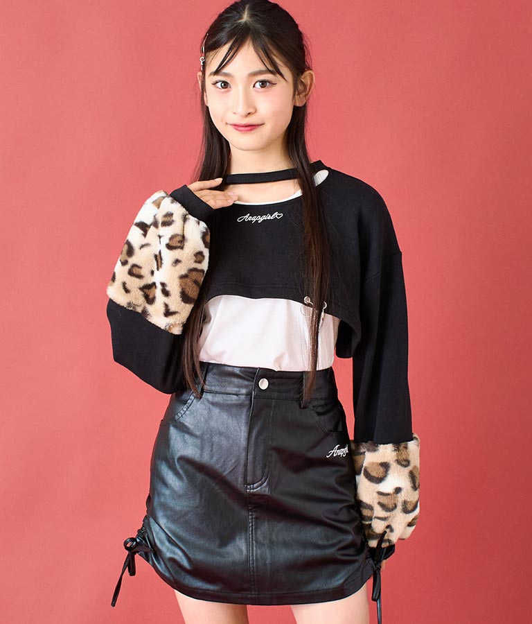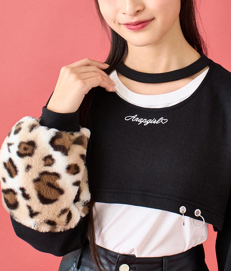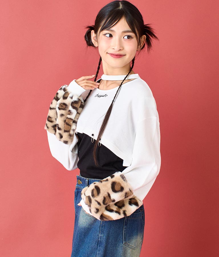 アームウォーマーのようなレオパード柄の袖や、チョーカー見えするネックデザイン、裾の二連リングなど、ディテールにこだわった一枚。