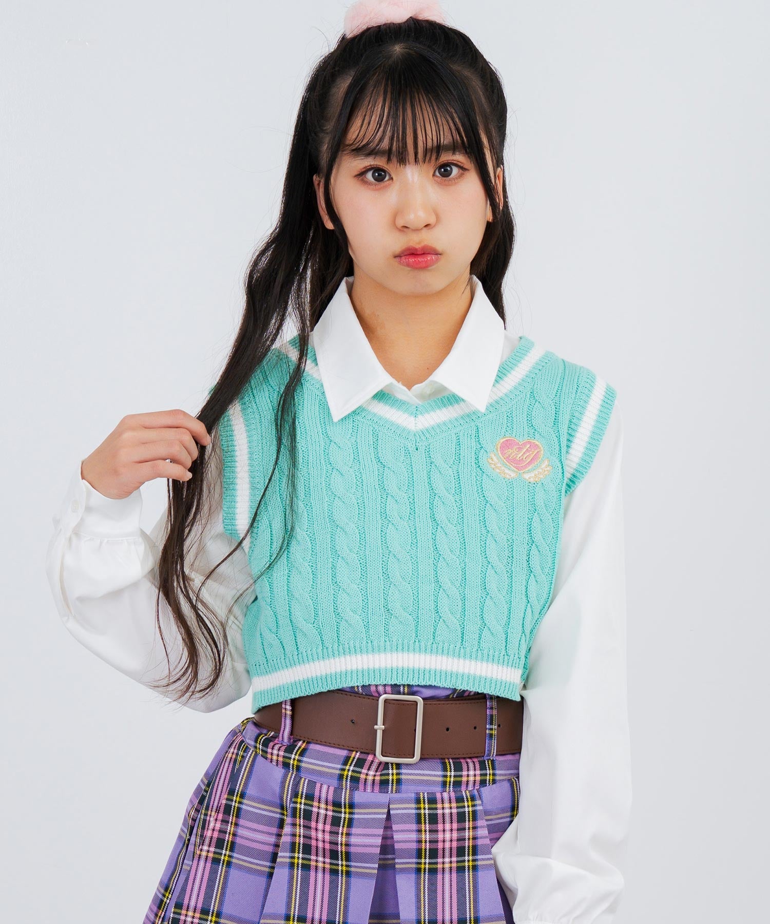 〇スクールライク→シャツとチェック柄ボトムを合わせて、きちんと感のあるスタイルに