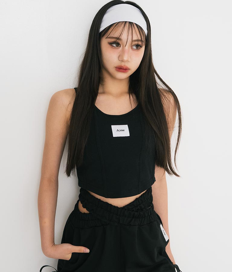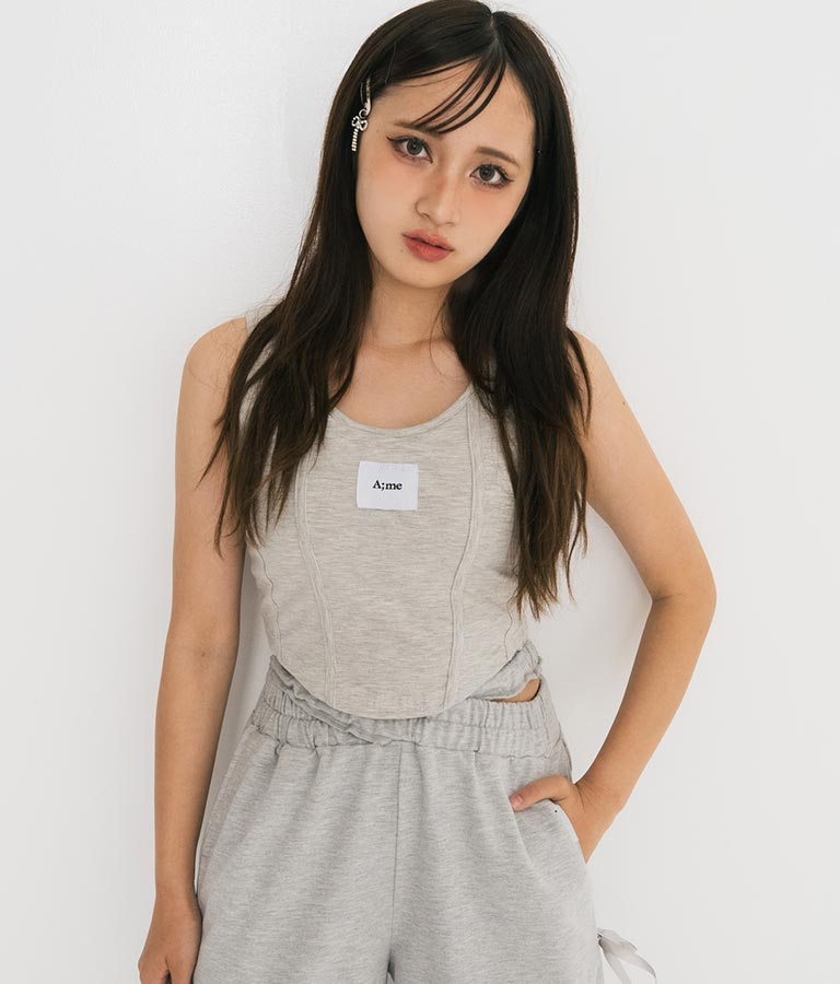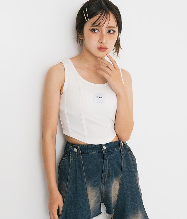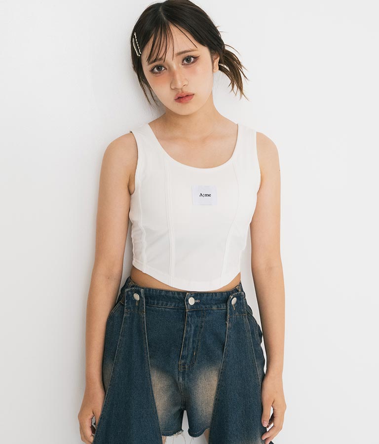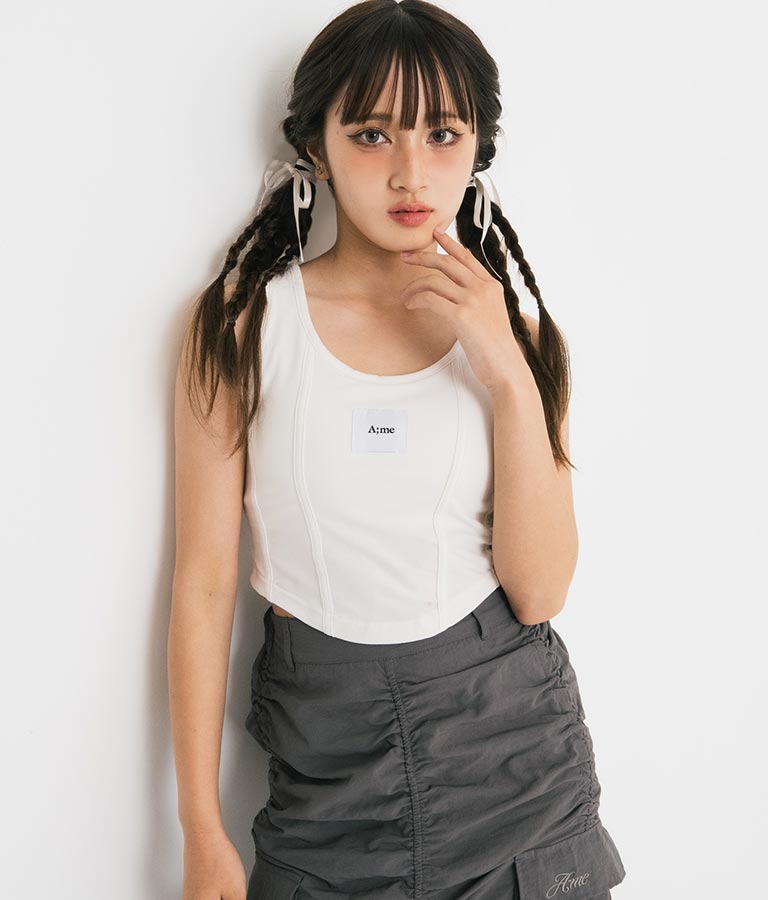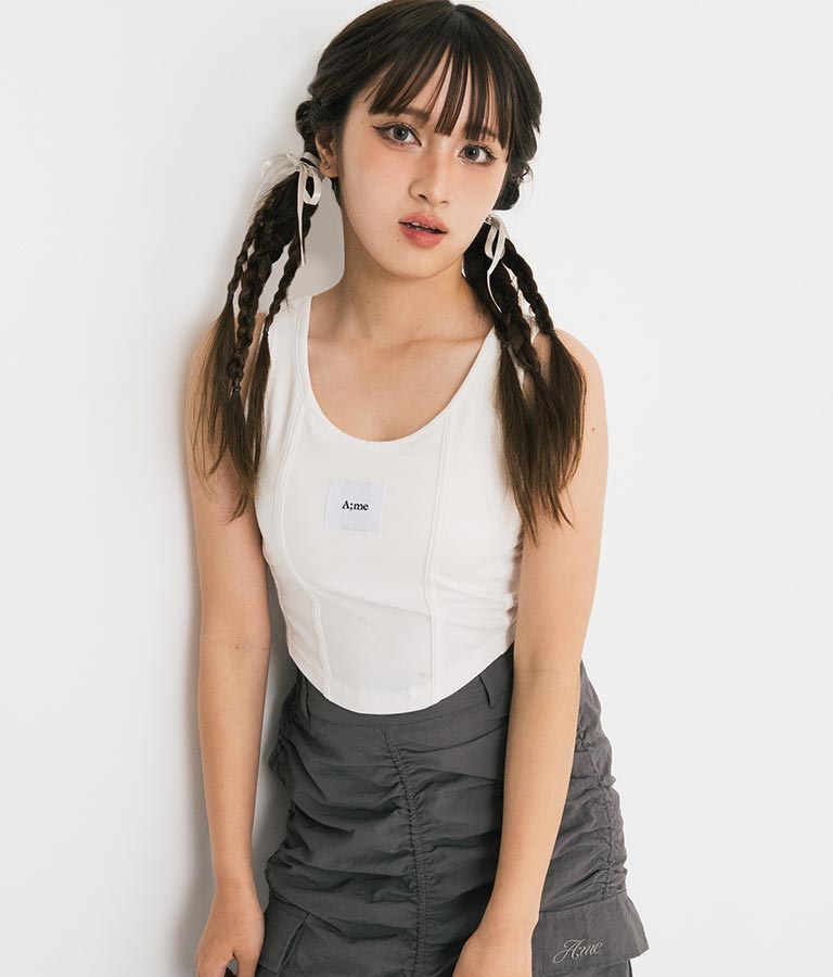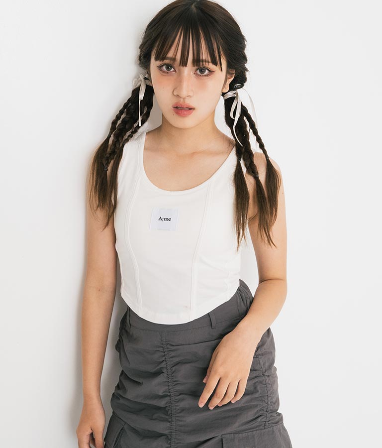 フロントに施したロゴがポイントになったコルセットデザインのタンクトップ。