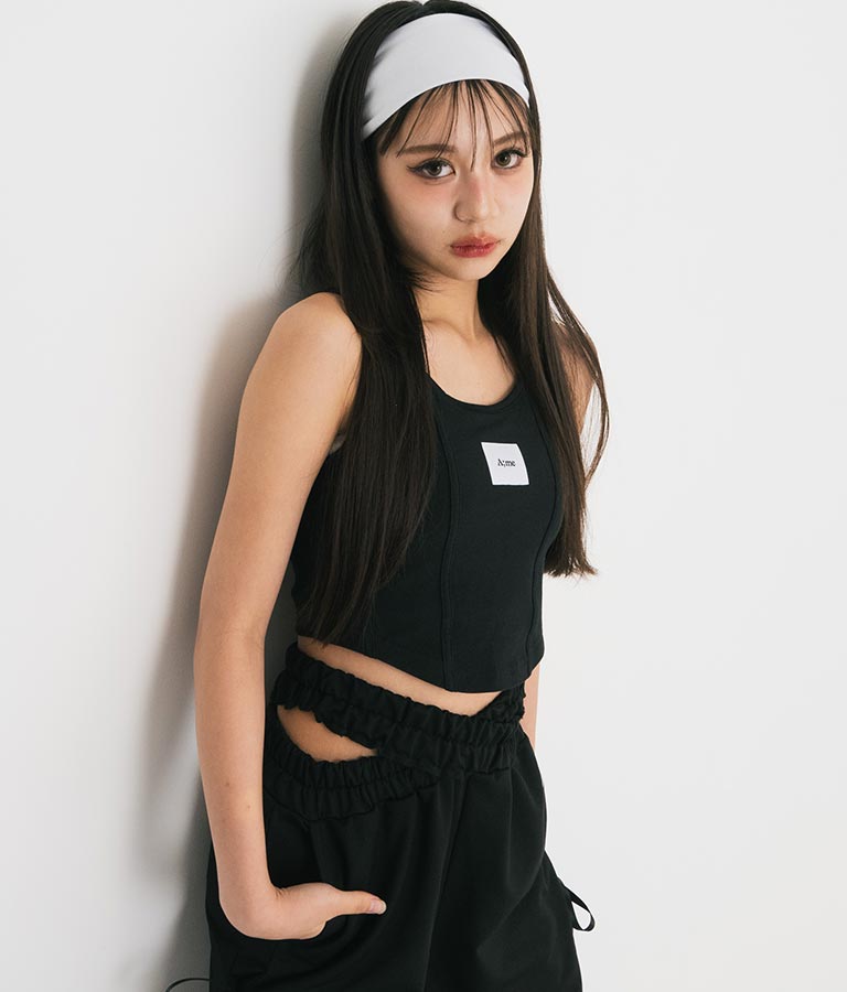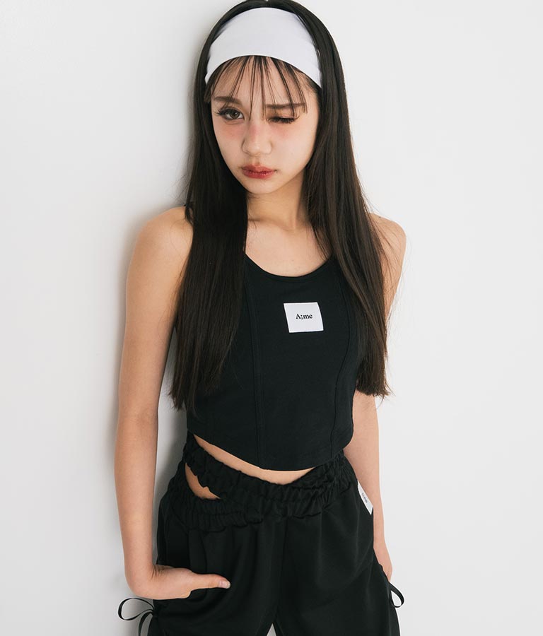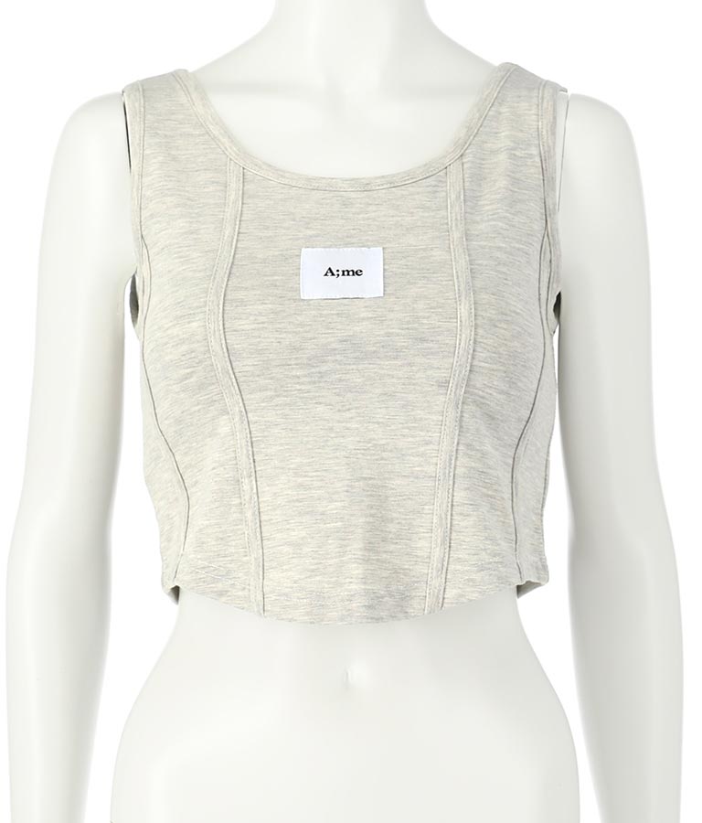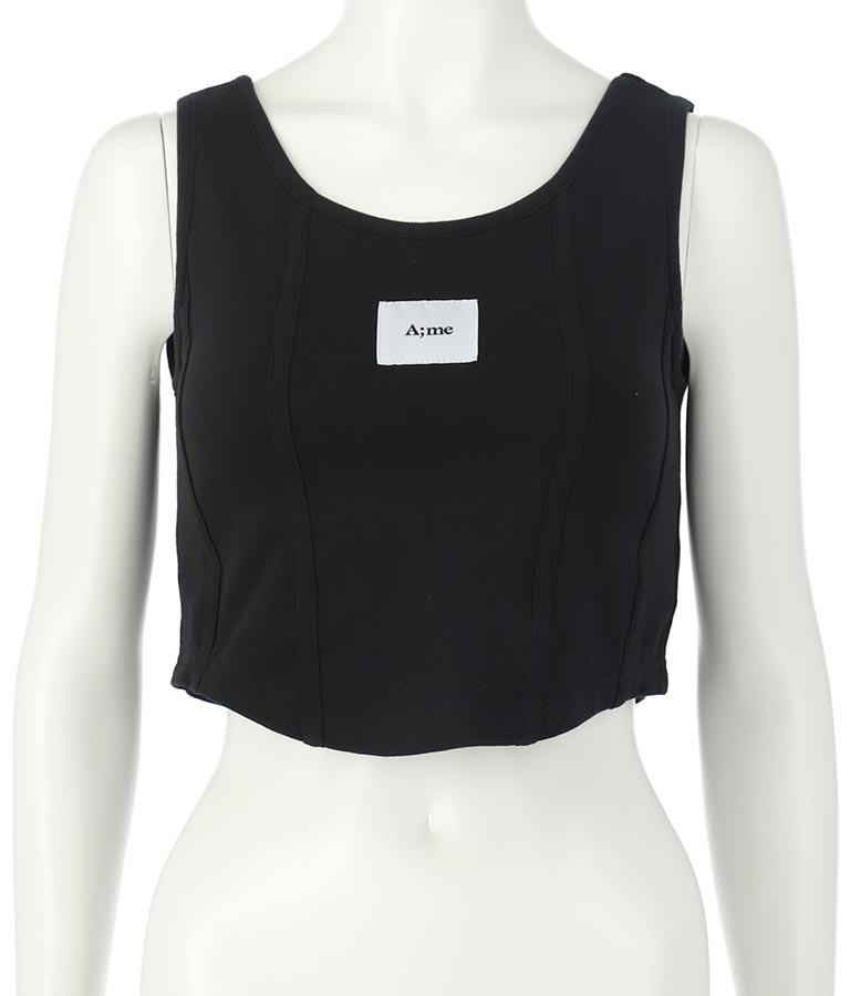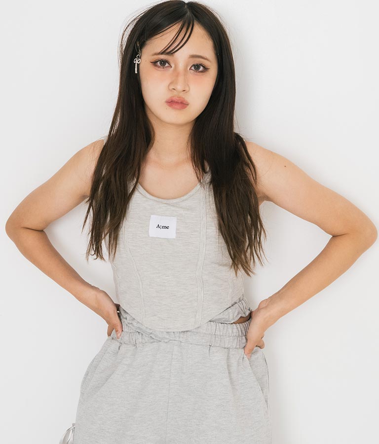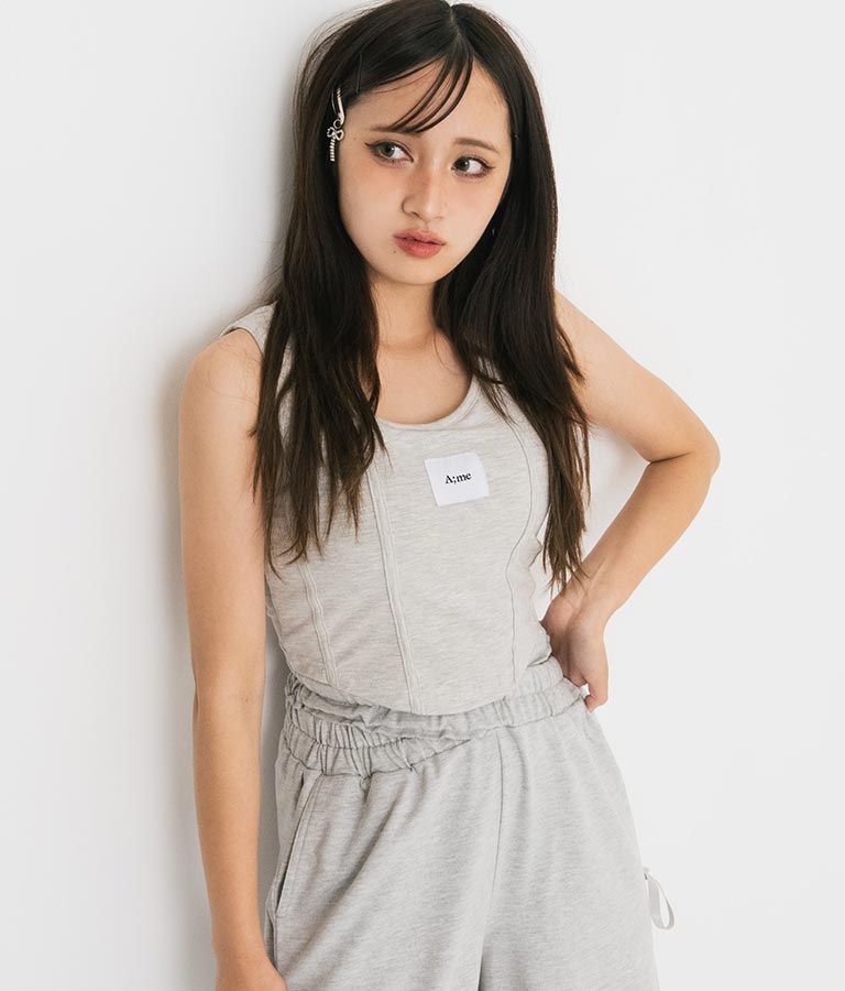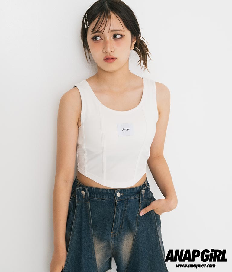 フロントに施したロゴがポイントになったコルセットデザインのタンクトップ。