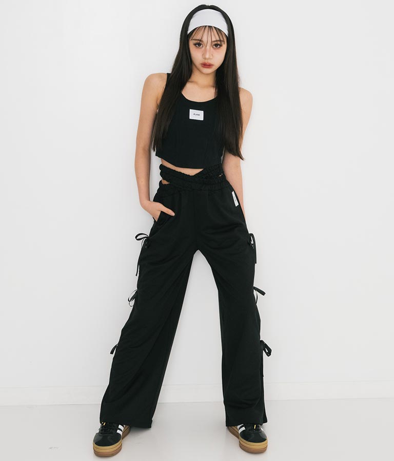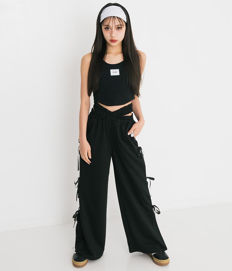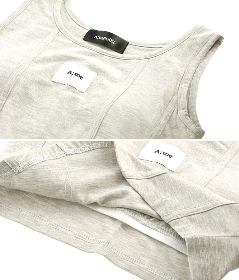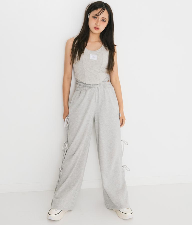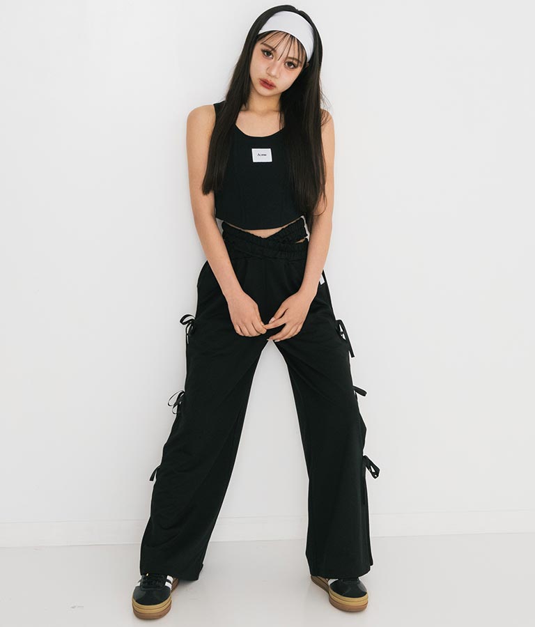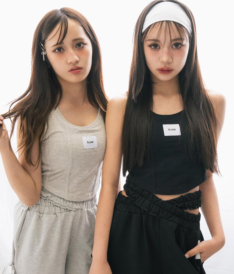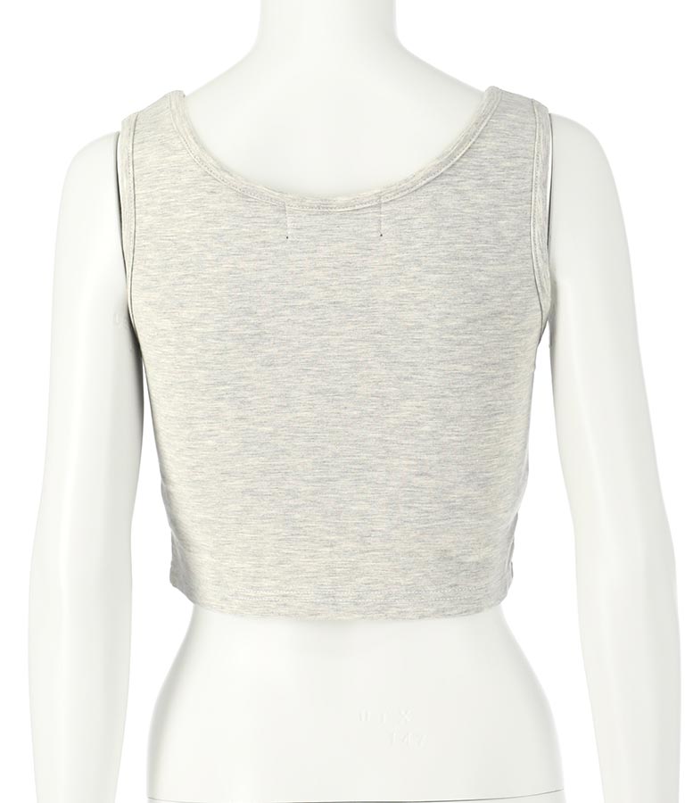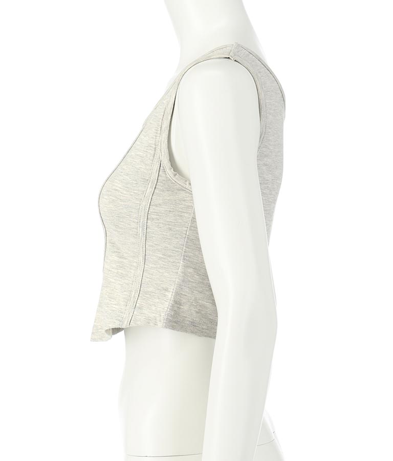 フロントに施したロゴがポイントになったコルセットデザインのタンクトップ。