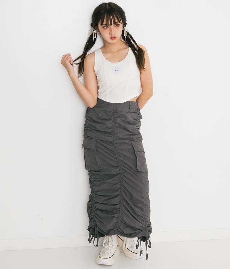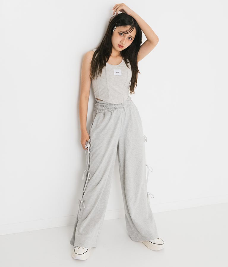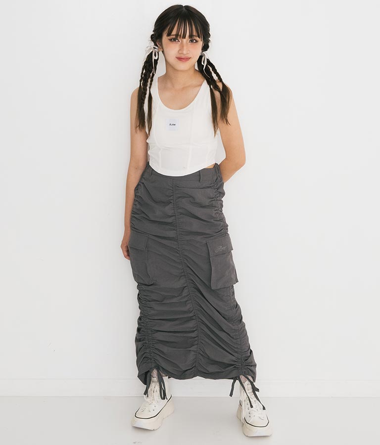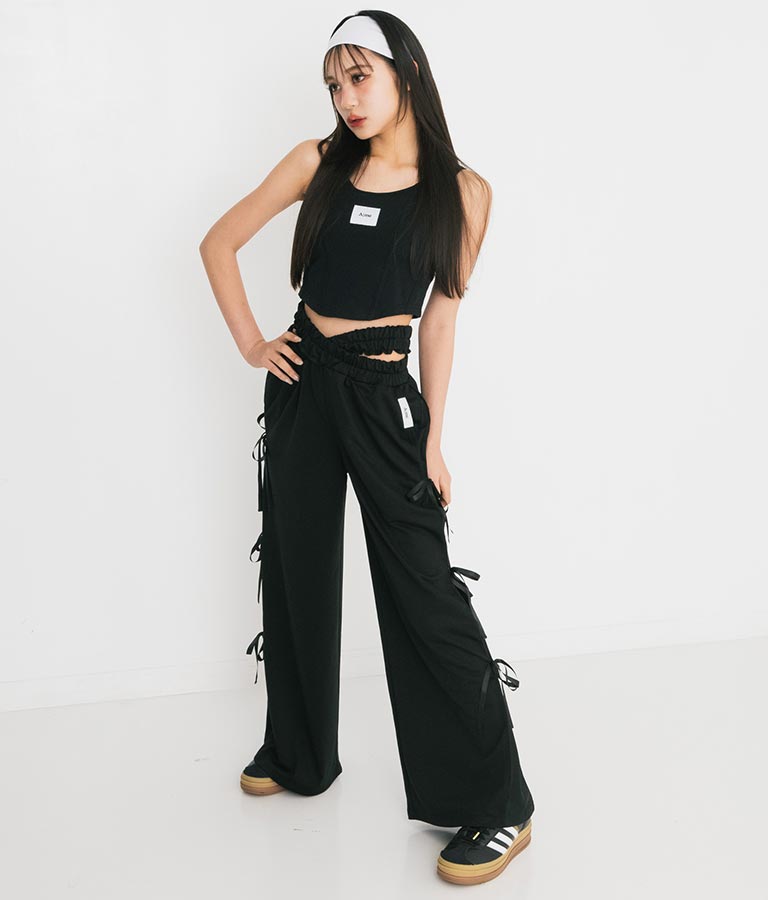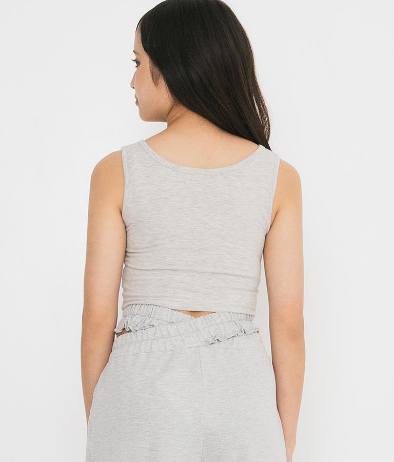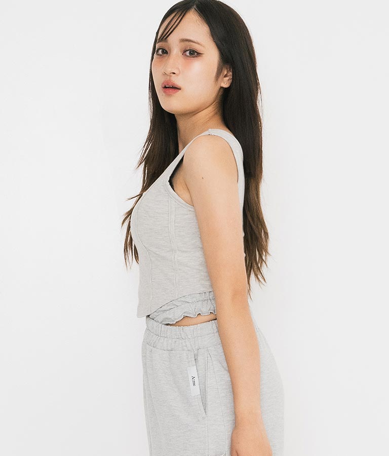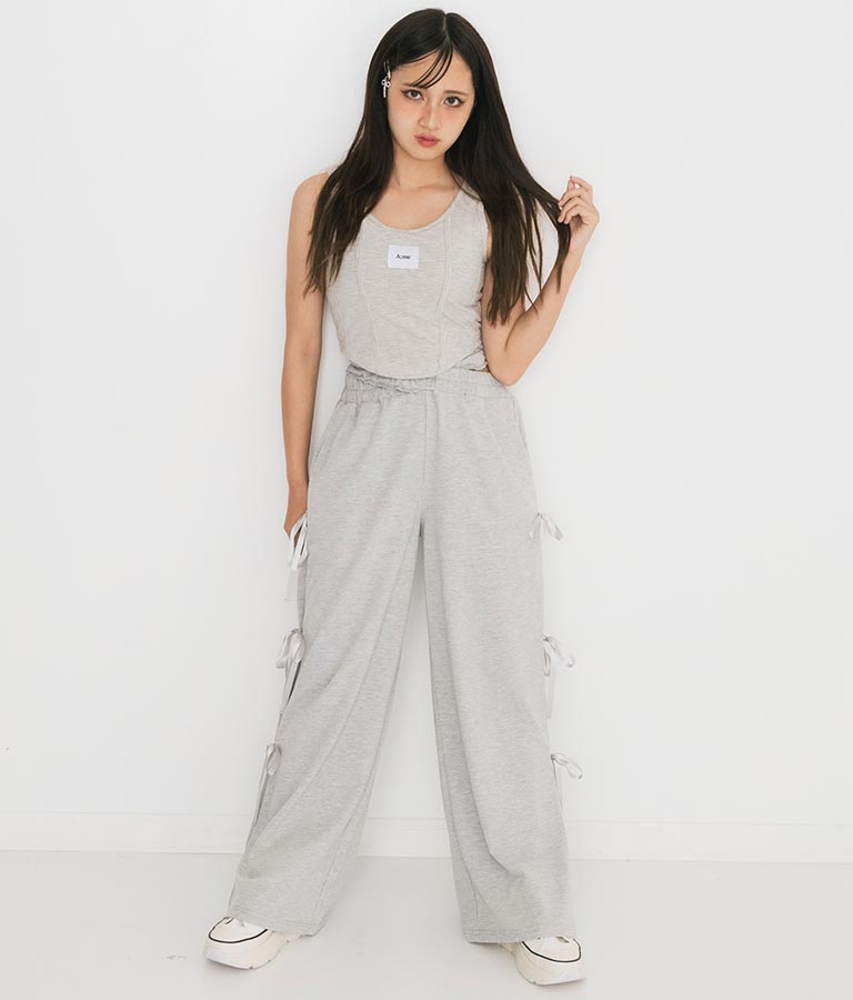 フロントに施したロゴがポイントになったコルセットデザインのタンクトップ。