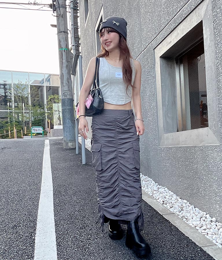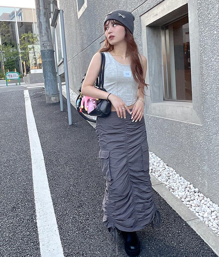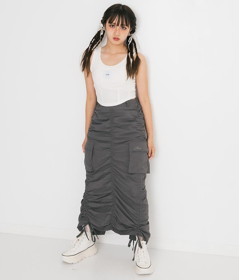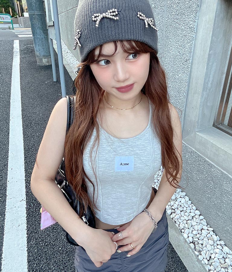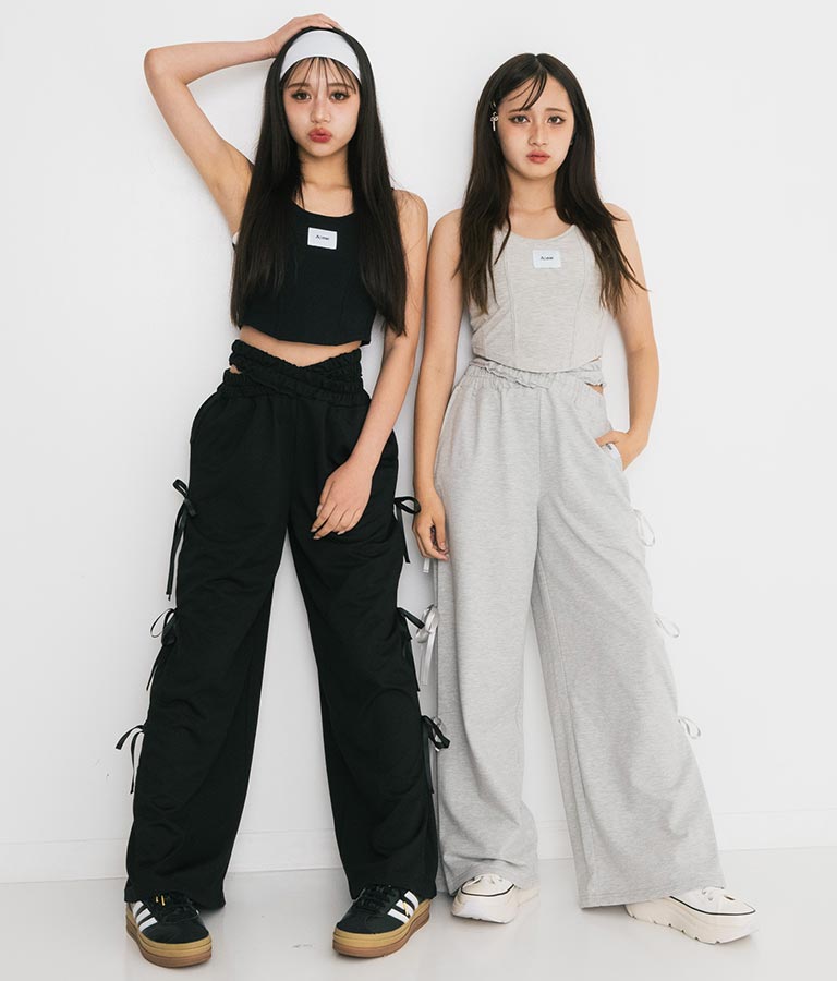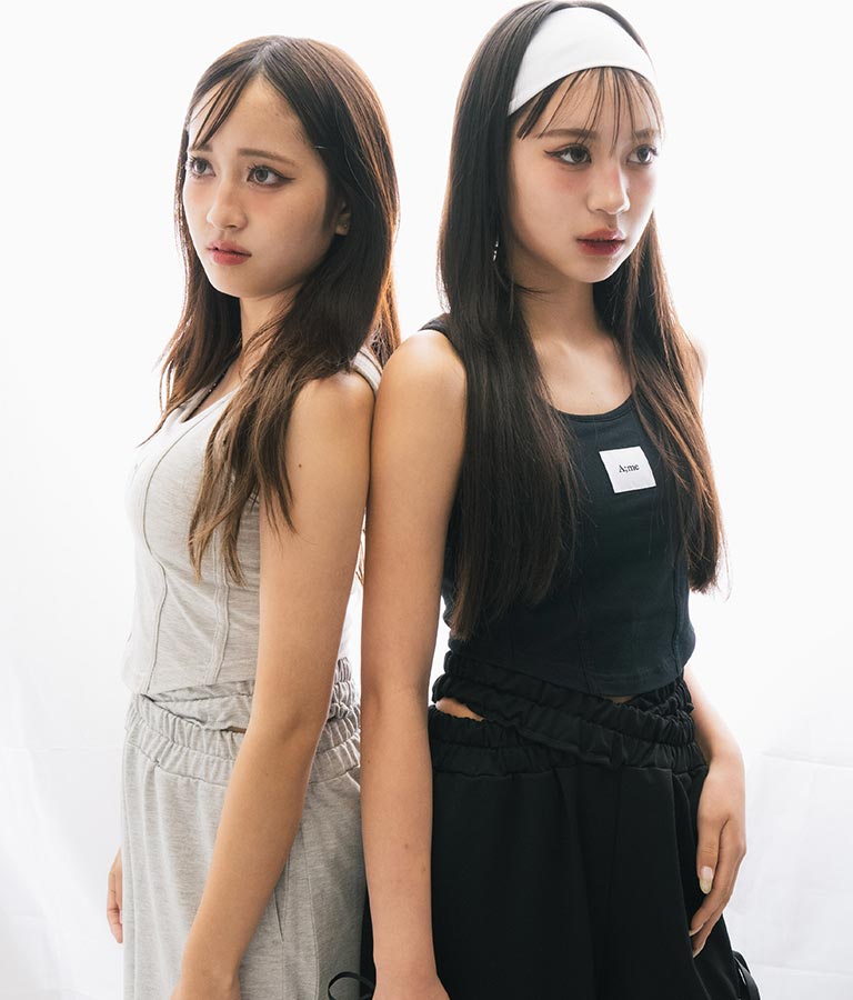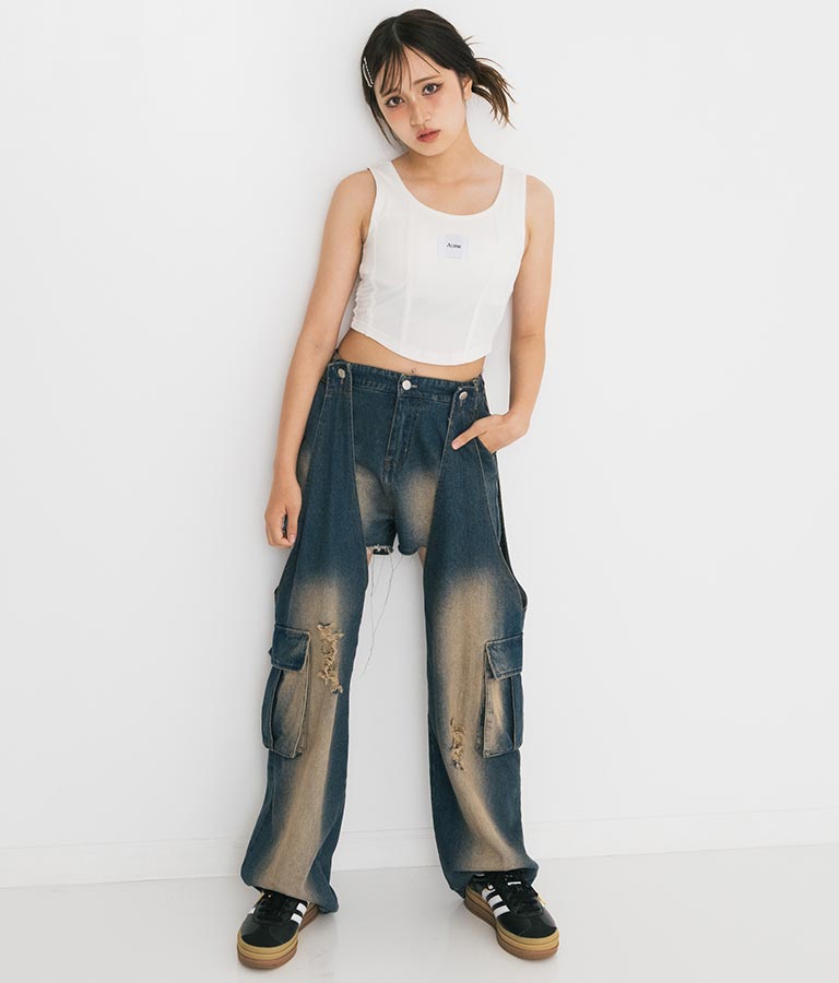 フロントに施したロゴがポイントになったコルセットデザインのタンクトップ。