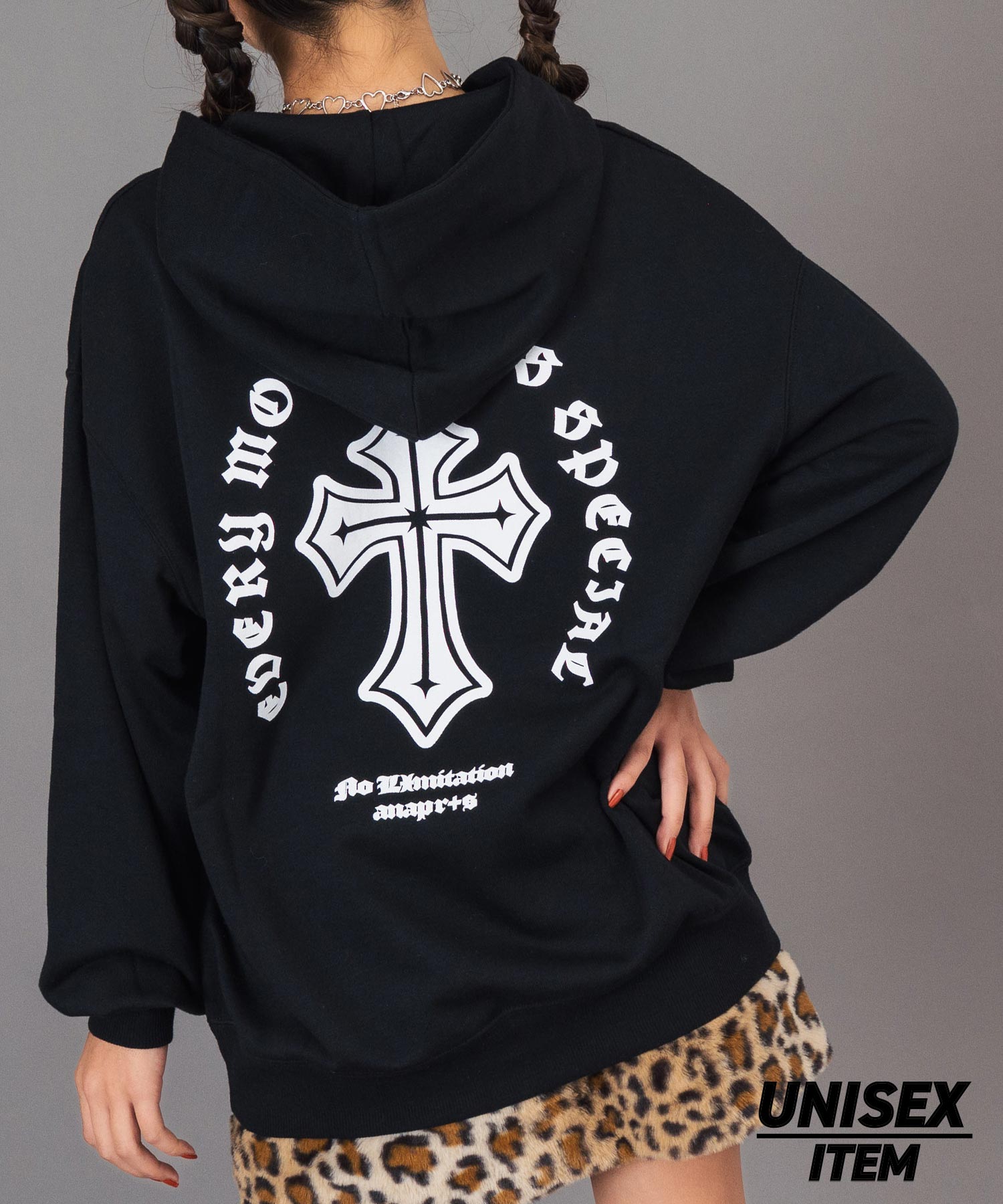 ゆるっとしたシルエットに、モードなクロスデザインが印象的。