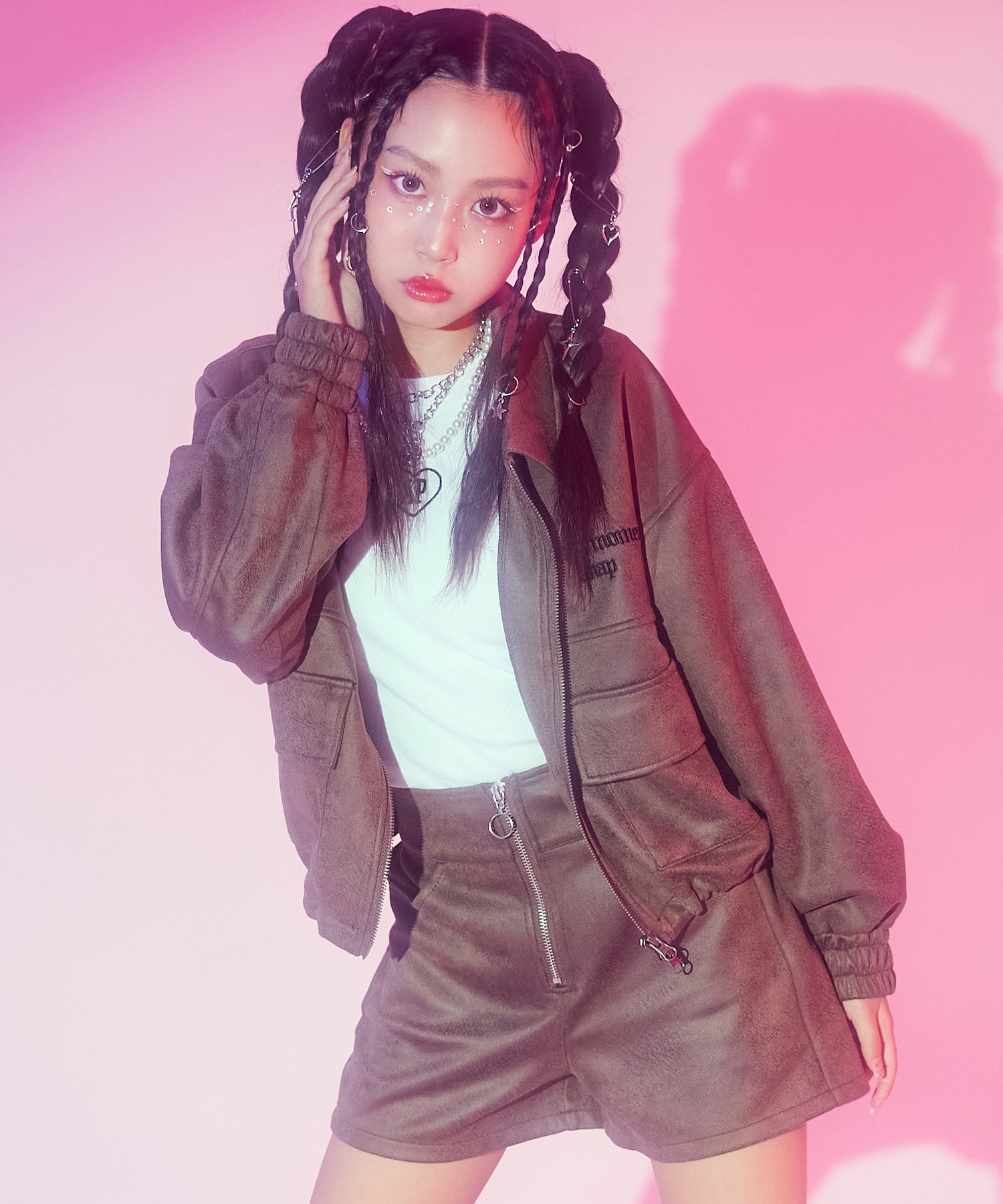 フロントに施されたジップデザインがアクセントになり、シンプルなトップスを合わせても洗練された印象に。