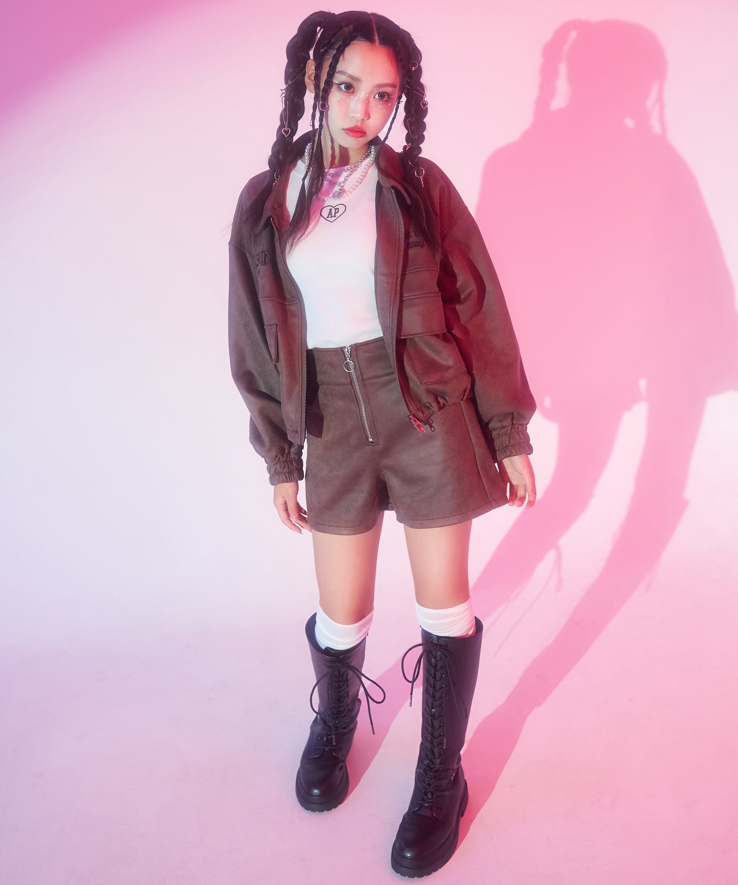 フェイクレザーを使用したショートパンツは、程よいハリ感でシルエットをすっきりと見せてくれます。