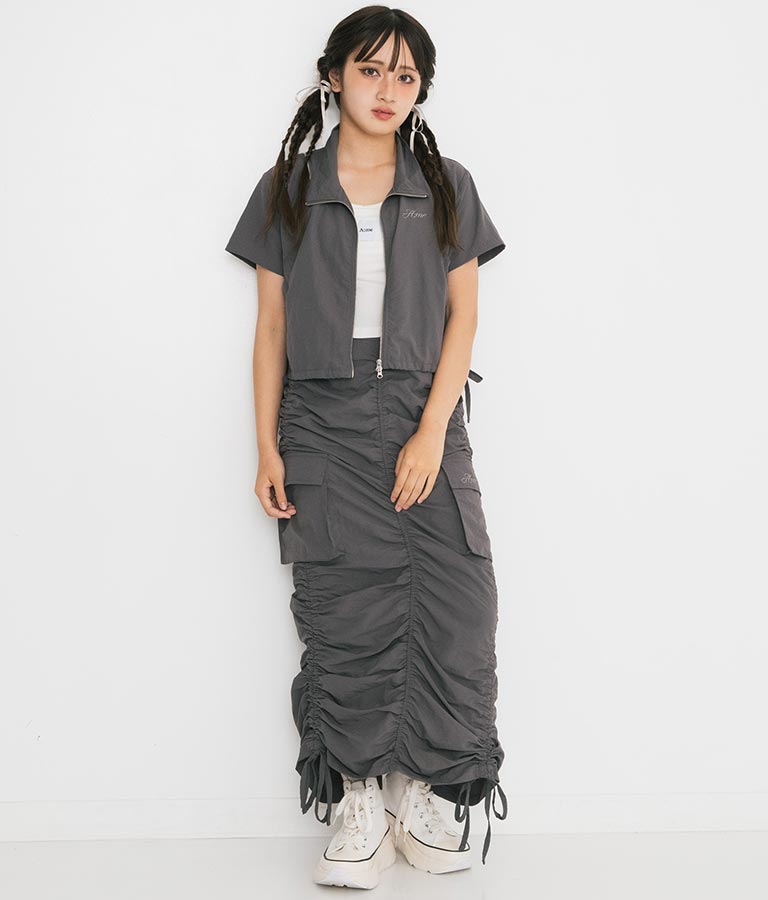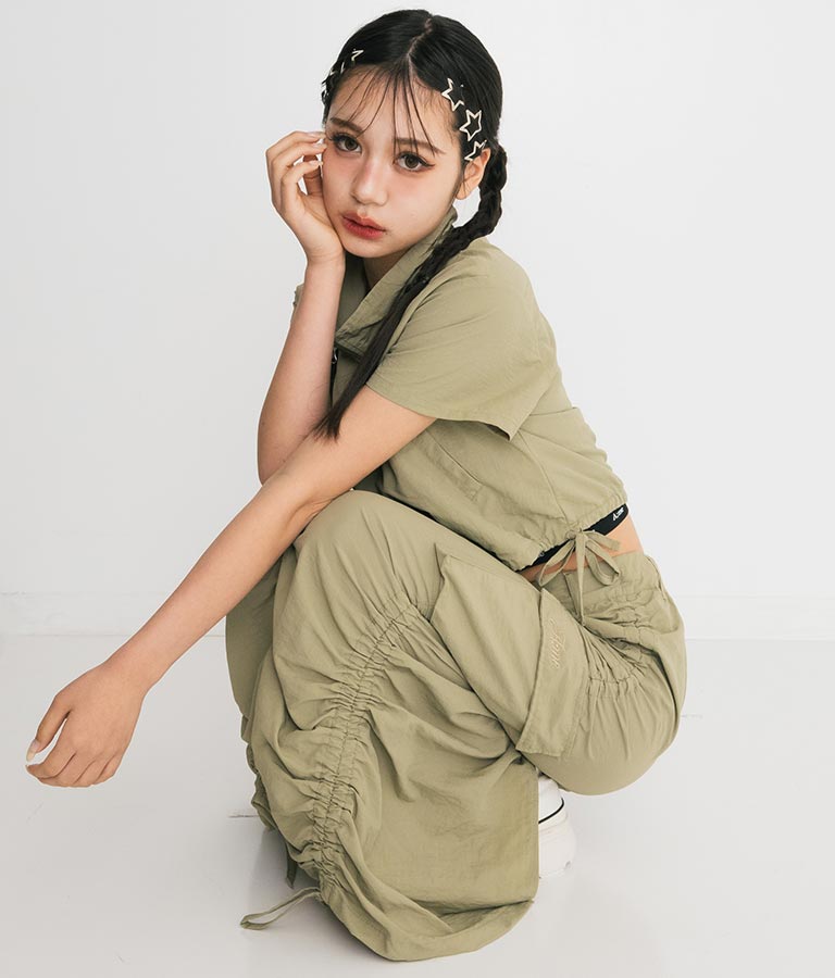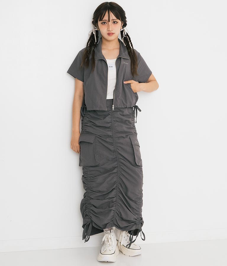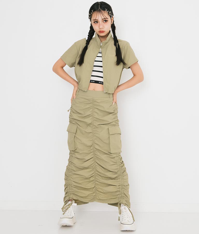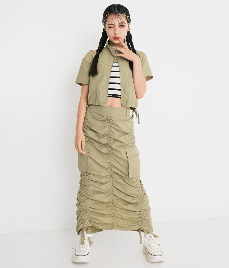同素材を使用した【シャーリング ナイロン カーゴ スカート】とセットアップでの着こなしもおすすめ◎