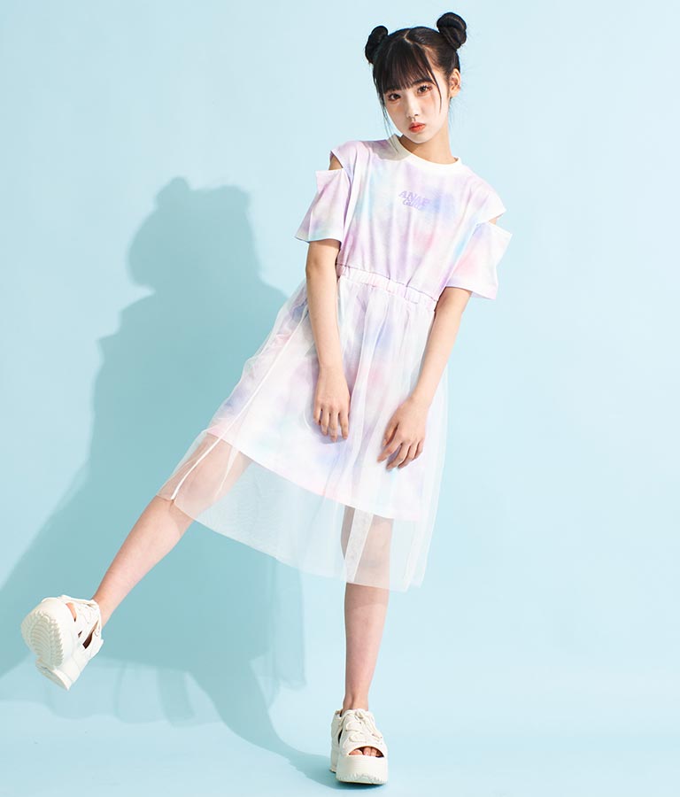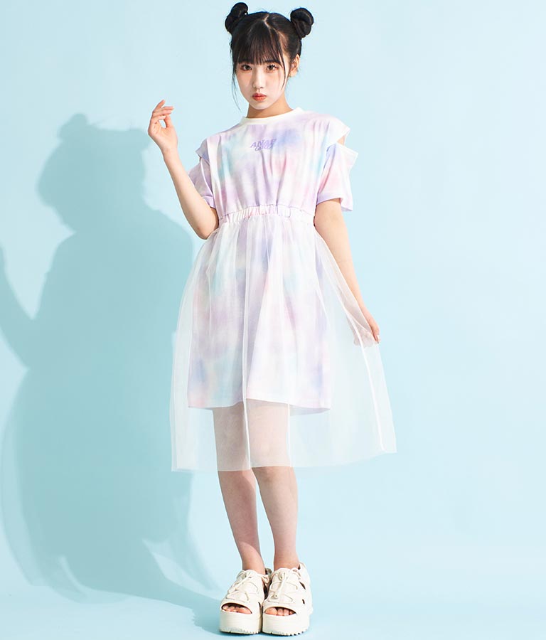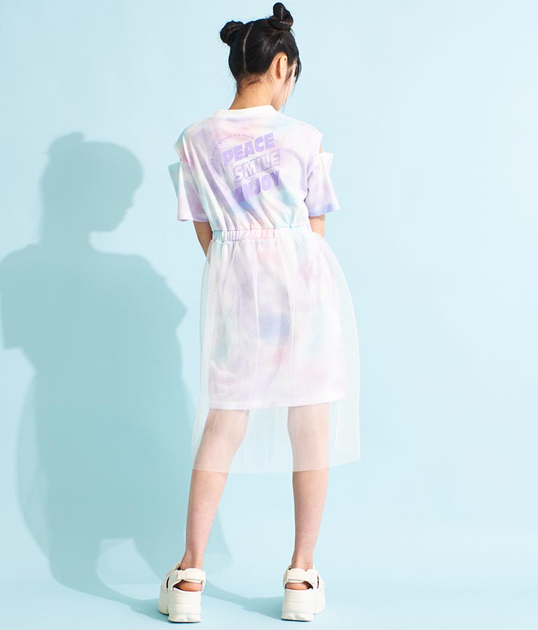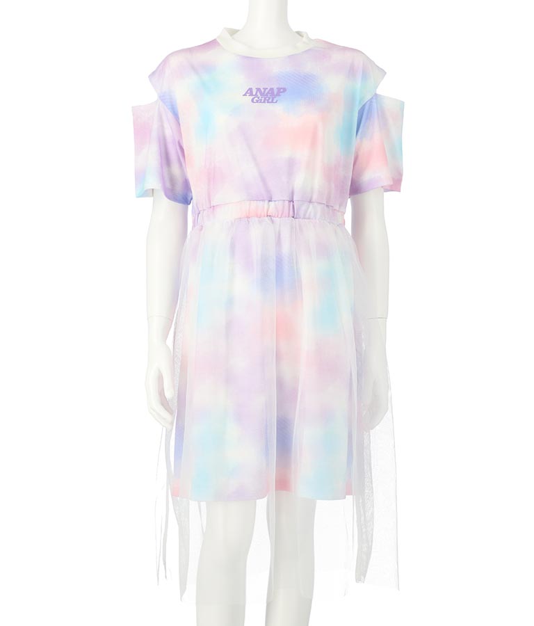肩開きデザインとチュール素材がおしゃれなタイダイ柄ワンピース♪