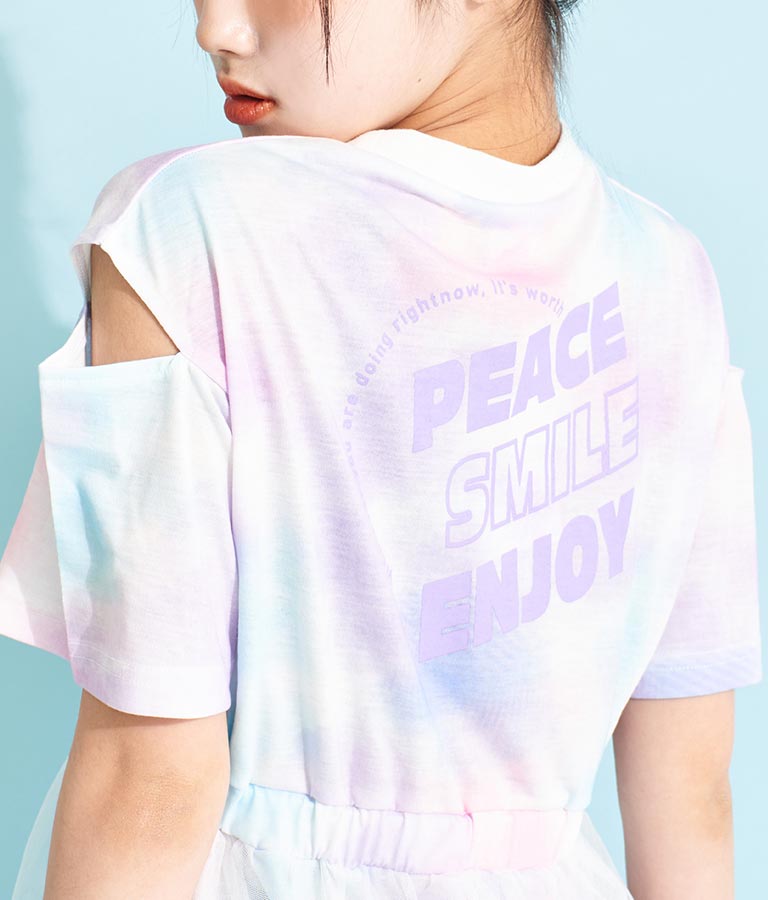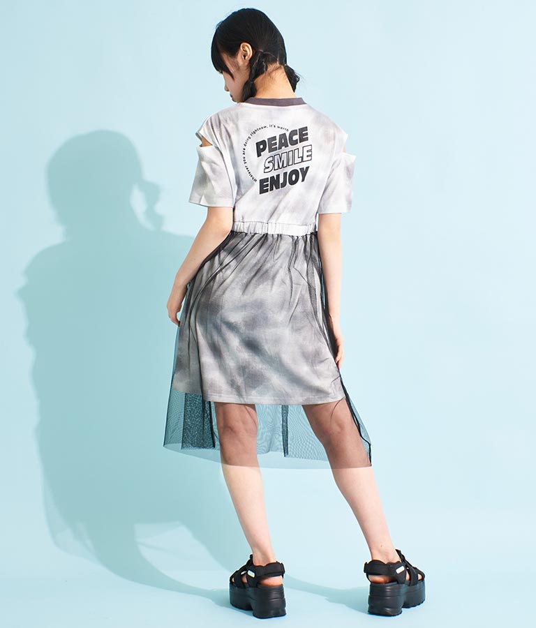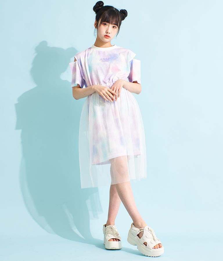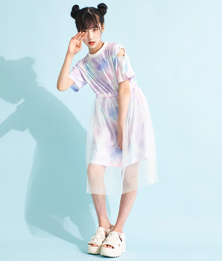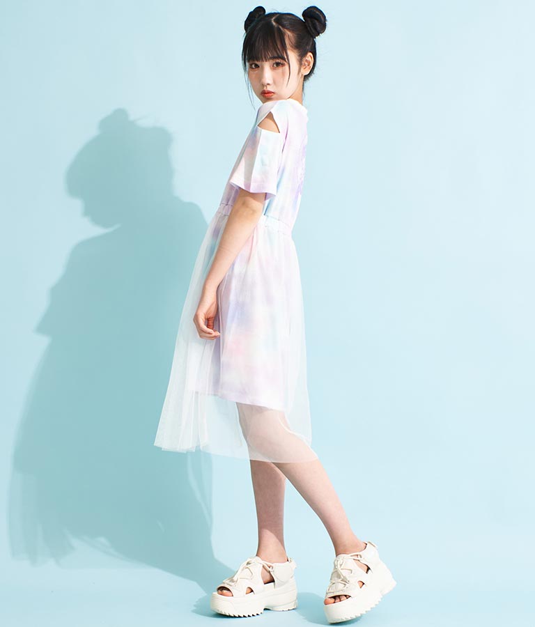 肩開きデザインとチュール素材がおしゃれなタイダイ柄ワンピース♪