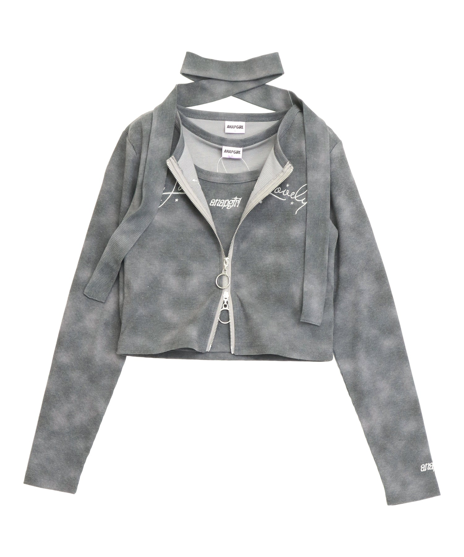 ストール付きのダブルジップトップスとタンクトップがセットになった、着回し力の高いアイテムです。トップスはコンパクトな丈感と程よいフィット感でバランスよく着こなせ、ダブルジップ仕様により開き具合を調整できるのも魅力。付属のストールは首元に巻くだけでなく、アレンジ次第でさまざまな表情を楽しめます。タンクトップ付きなのでインナー選びに悩まず、レイヤードが簡単に完成。単品使いもできるため、シーズンを通して幅広いコーディネートに活躍します。