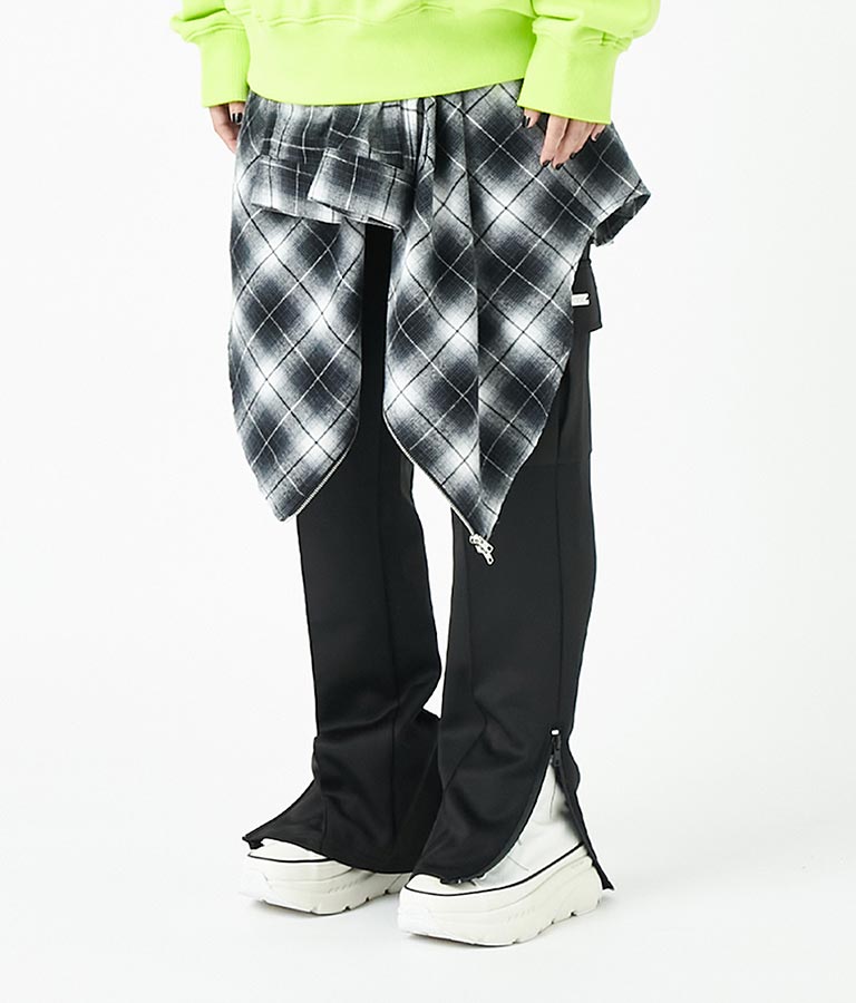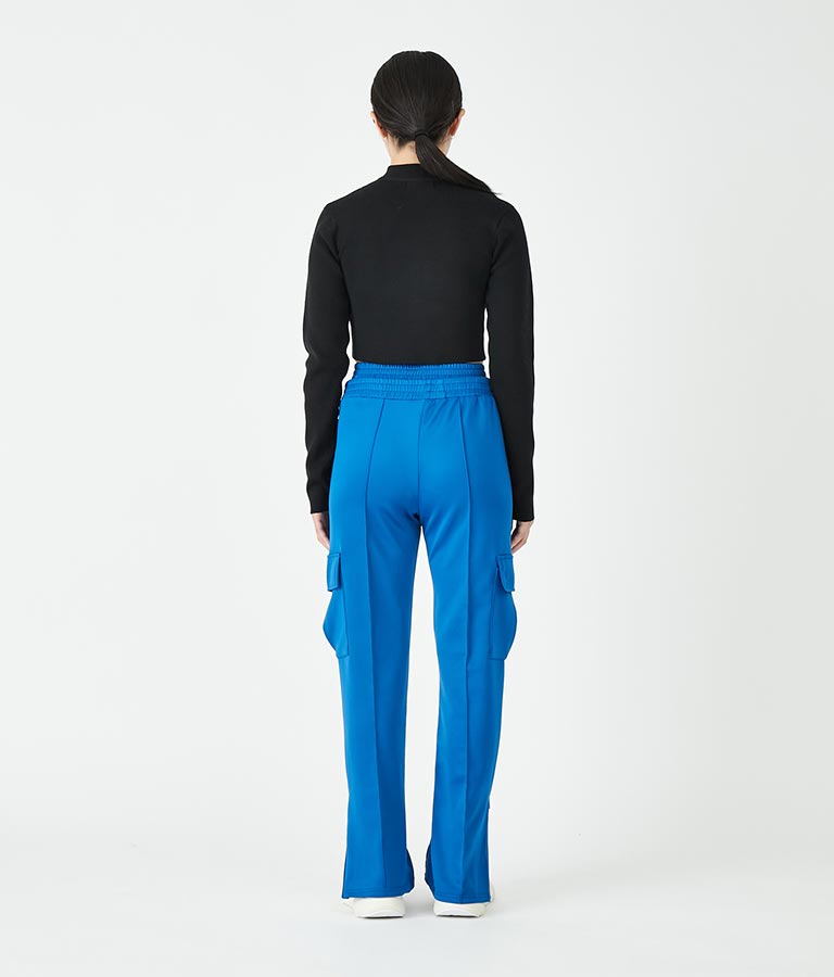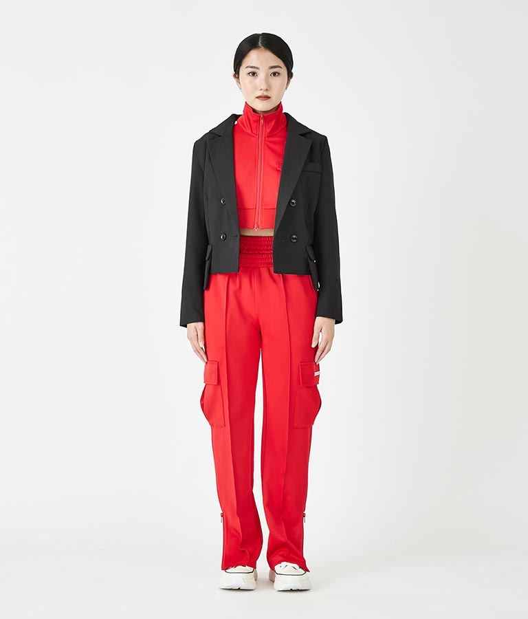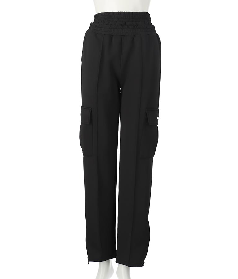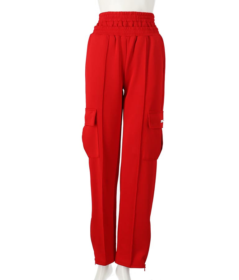重なったようなダブルのウエストデザインが個性たっぷりのトラックパンツ。