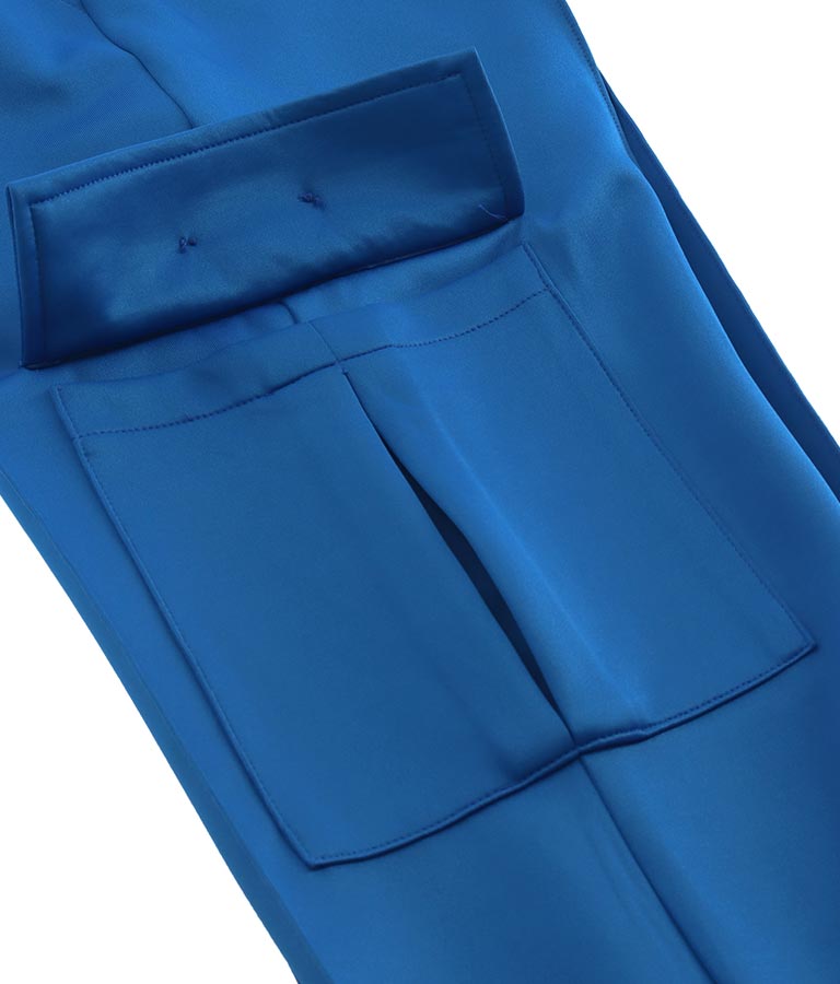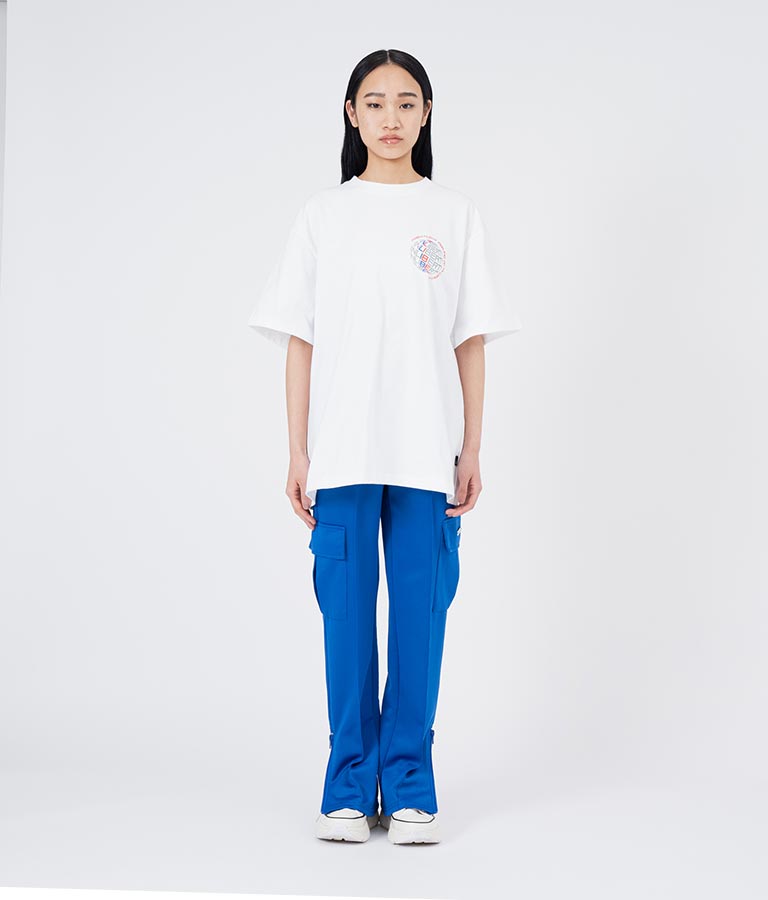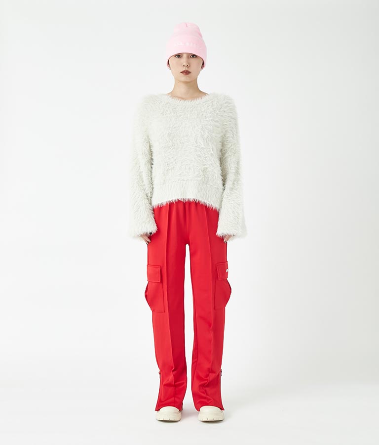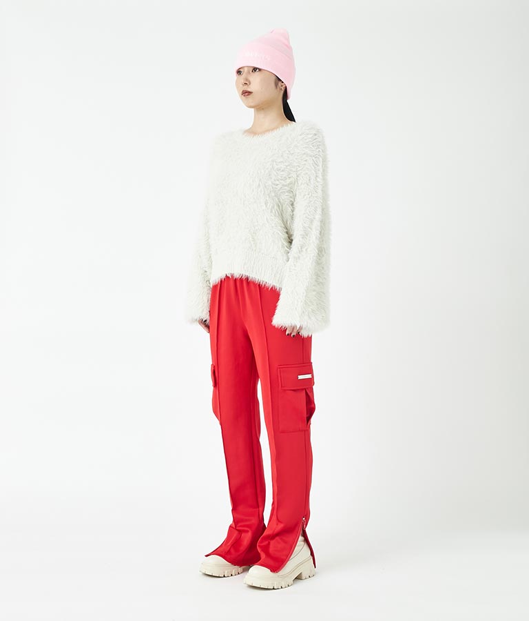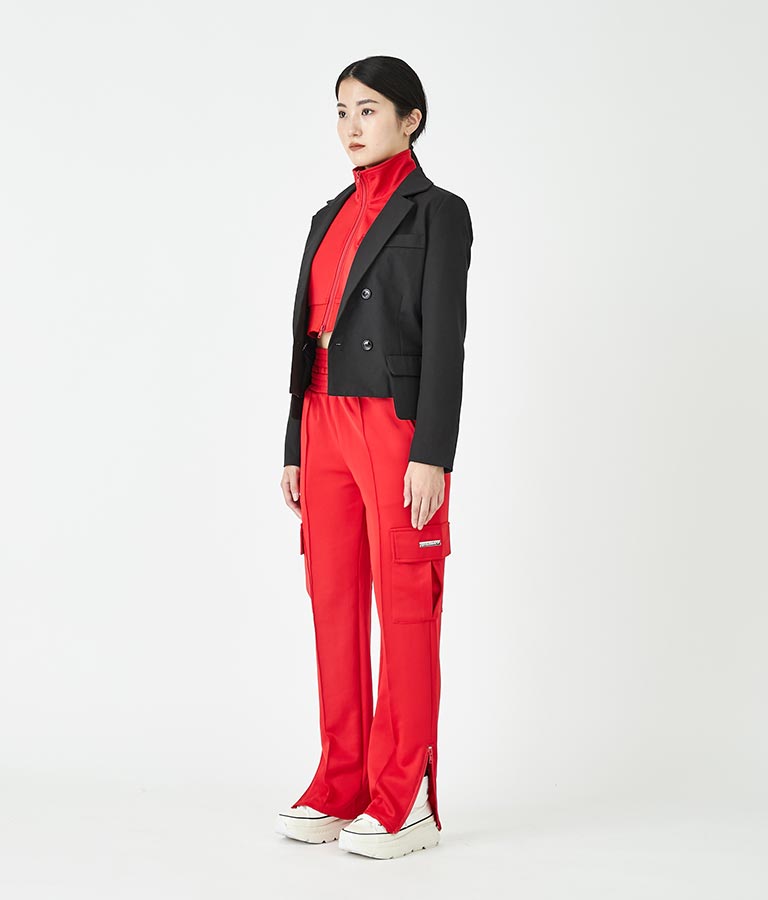 重なったようなダブルのウエストデザインが個性たっぷりのトラックパンツ。