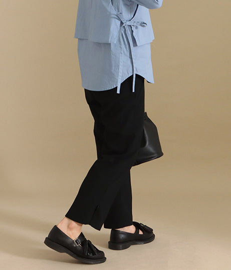 センタープレスと裾の両サイドに入れたジップを自分で好きな長さに開けてスリットを入れることで、